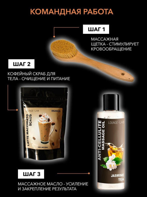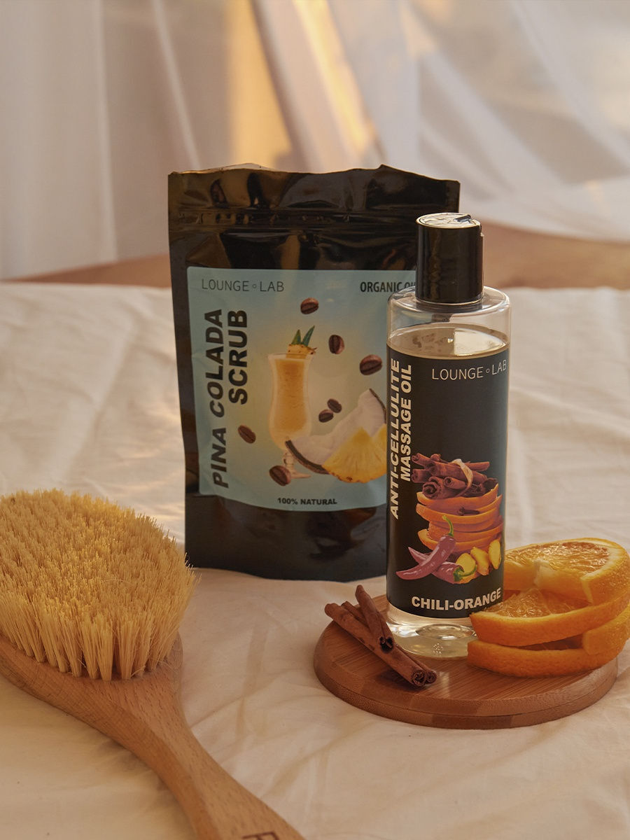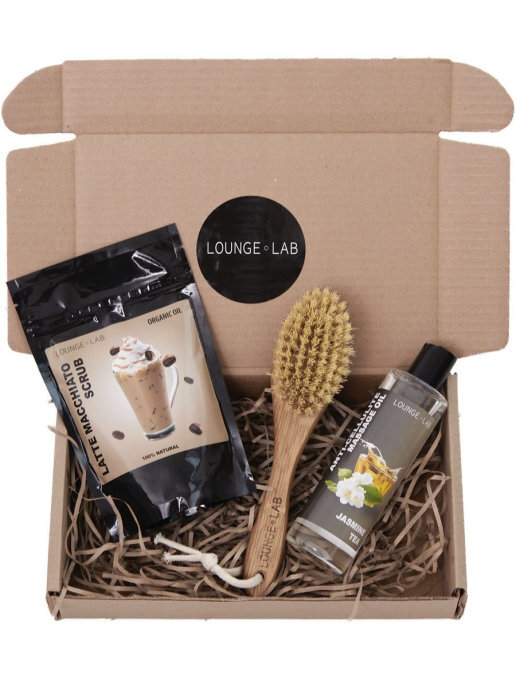 LOUNGE LAB Антицеллюлитный набор для тела "Разогревающий". Скраб, масло и щетка