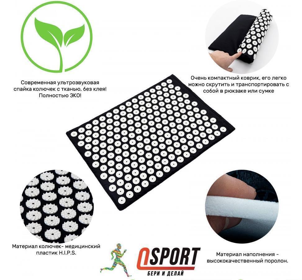 Массажный акупунктурный коврик с подушкой черный - аппликатор Кузнецова