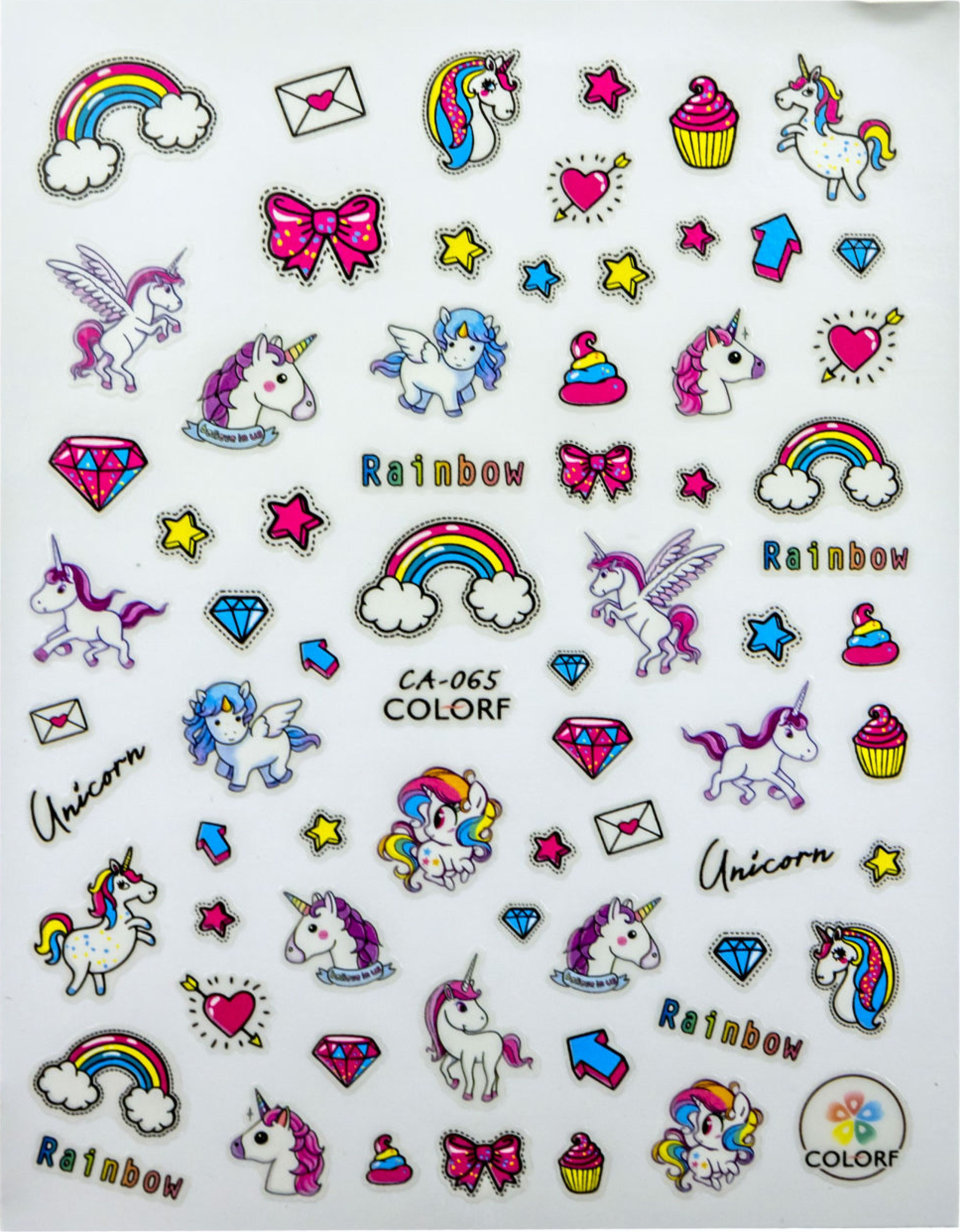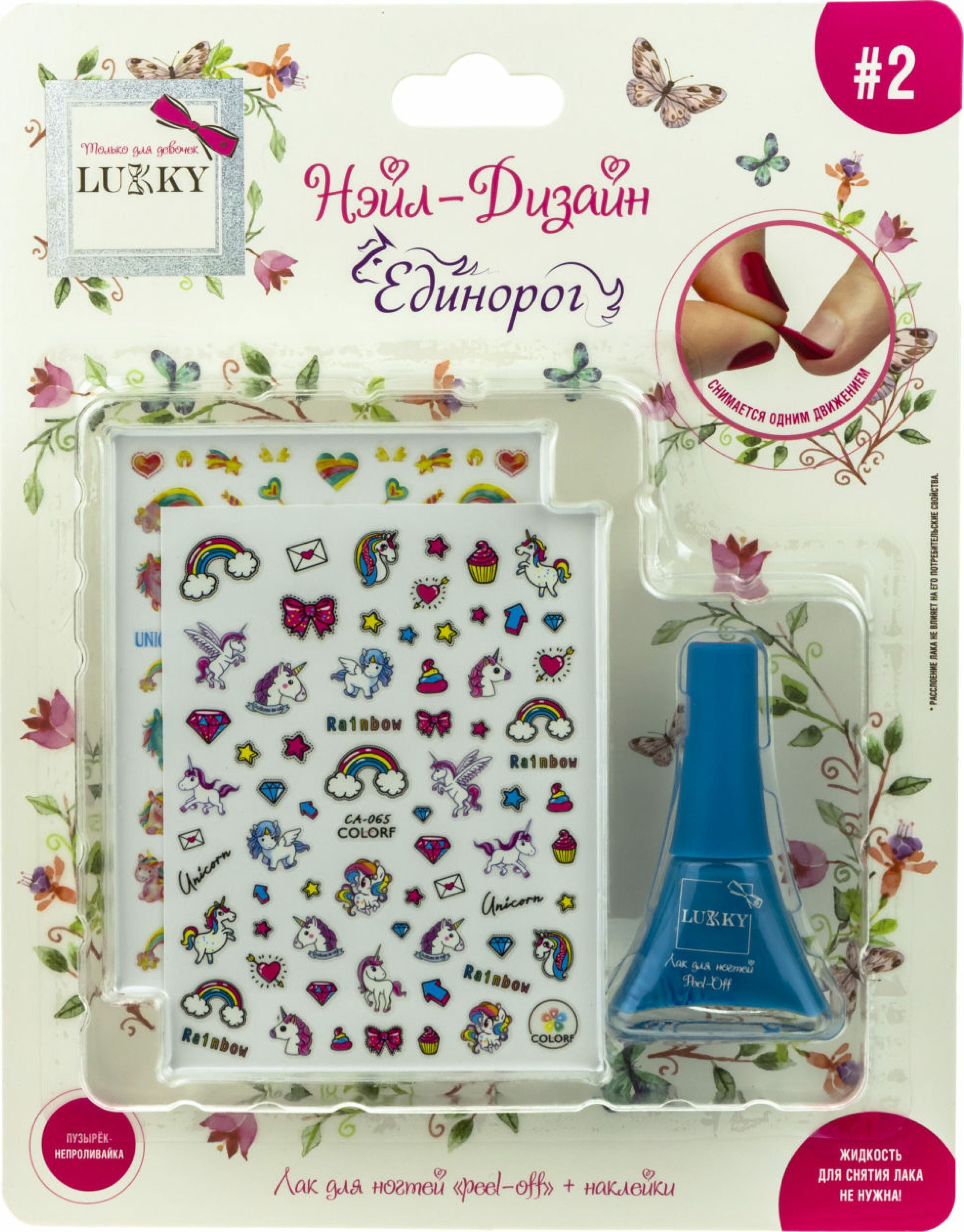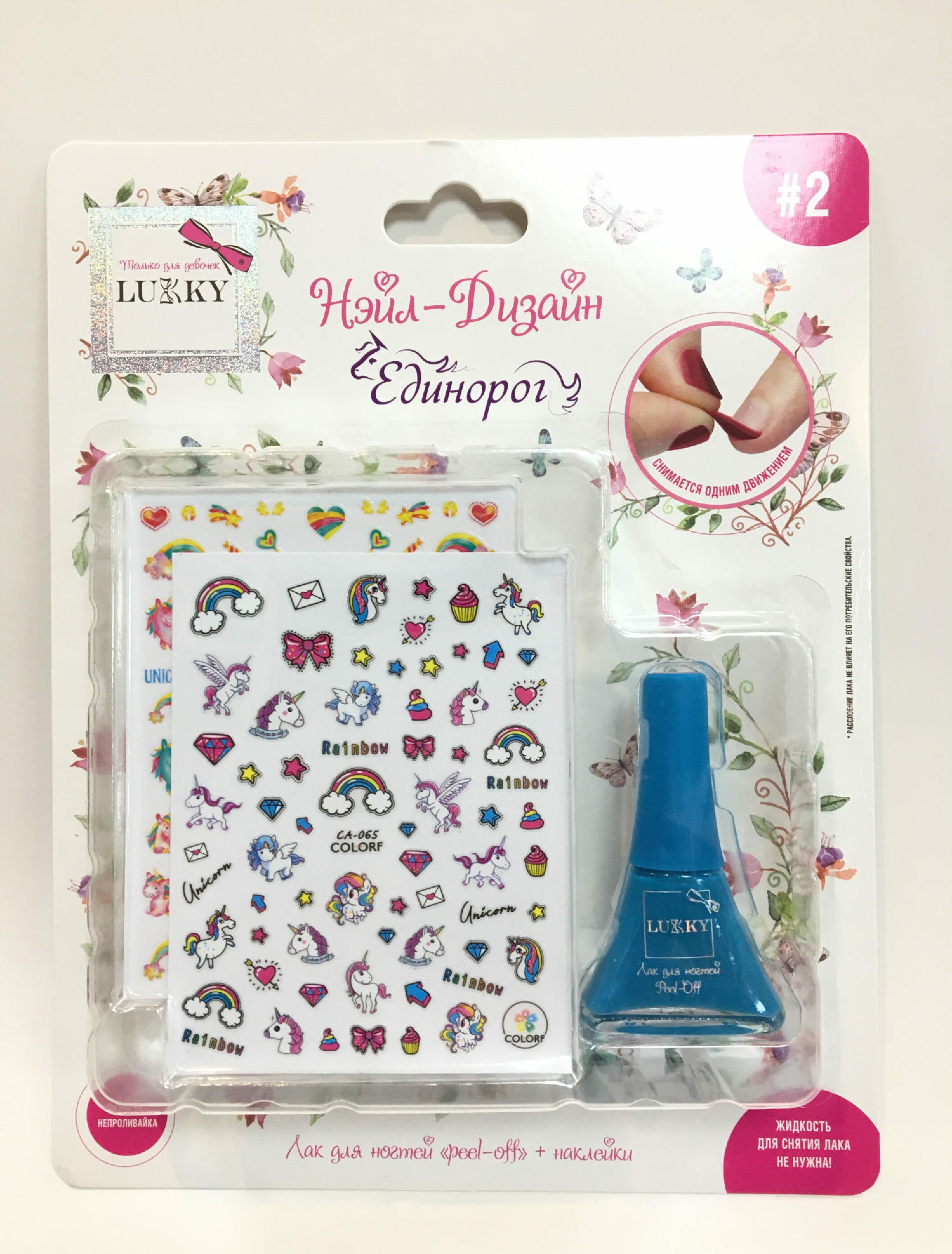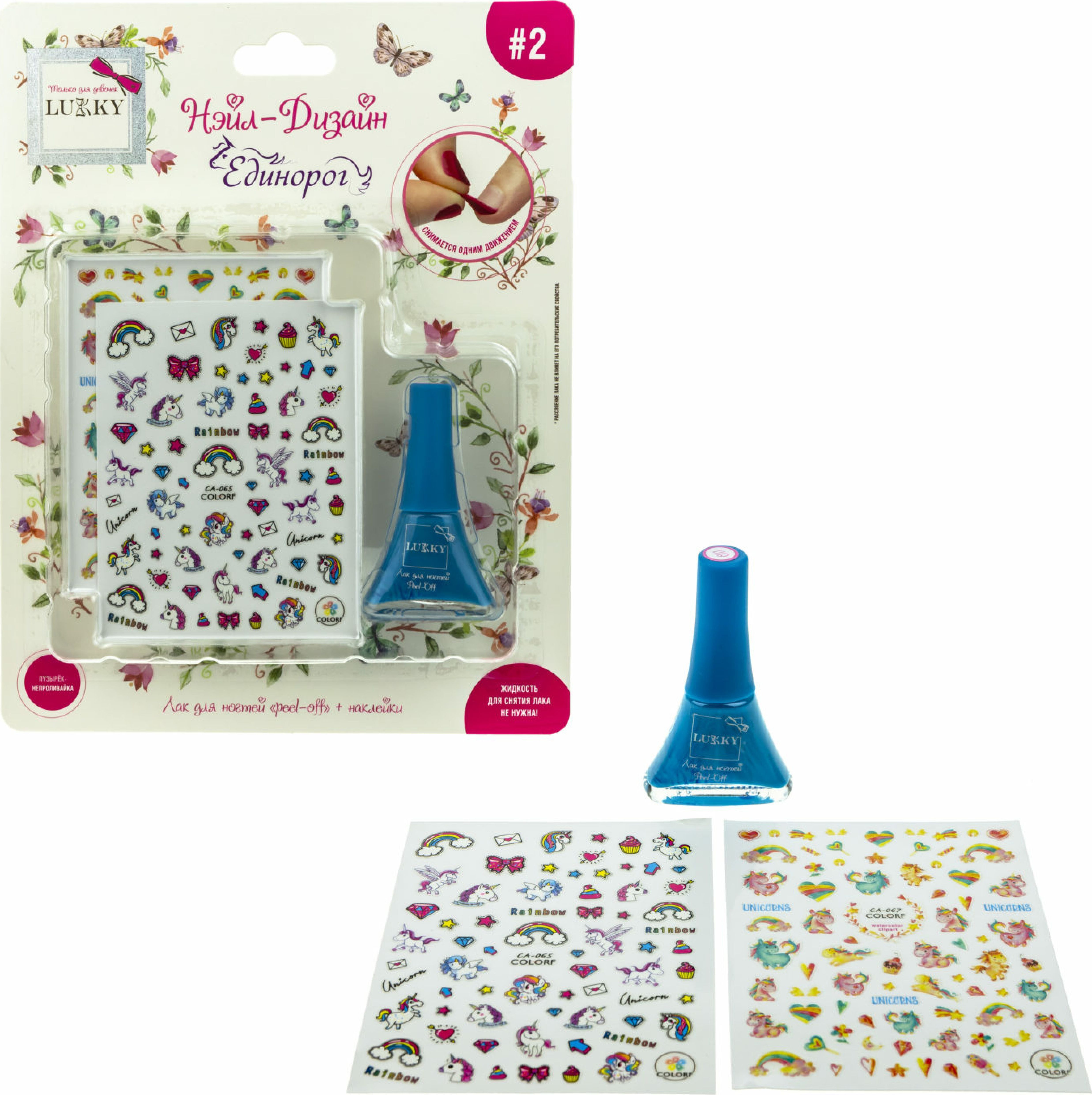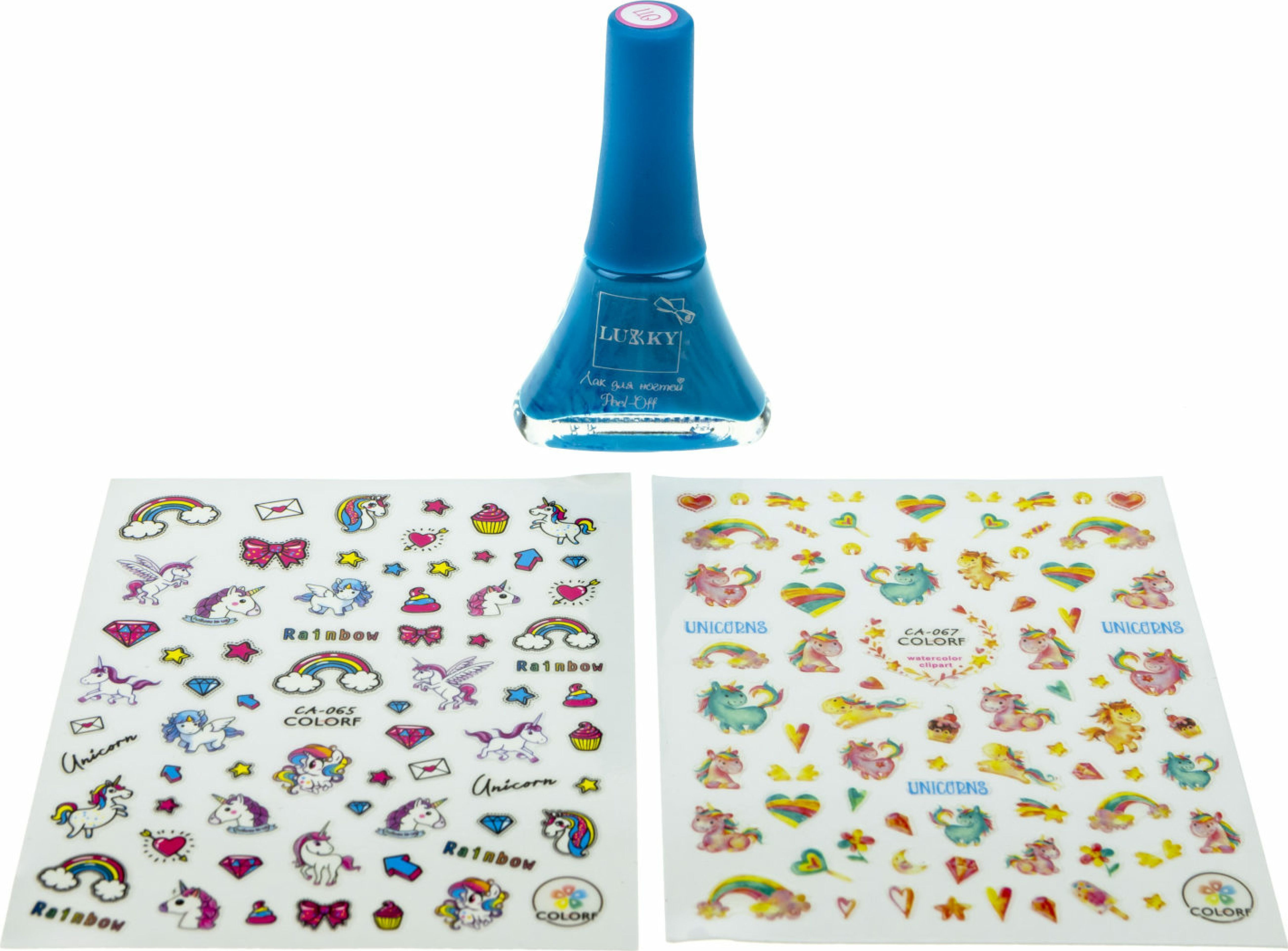 Lukky Нэйл-Дизайн #2 Набор: Лак для ногтей peel-off, цвет голубой + Наклейки Единорог, 2 листа