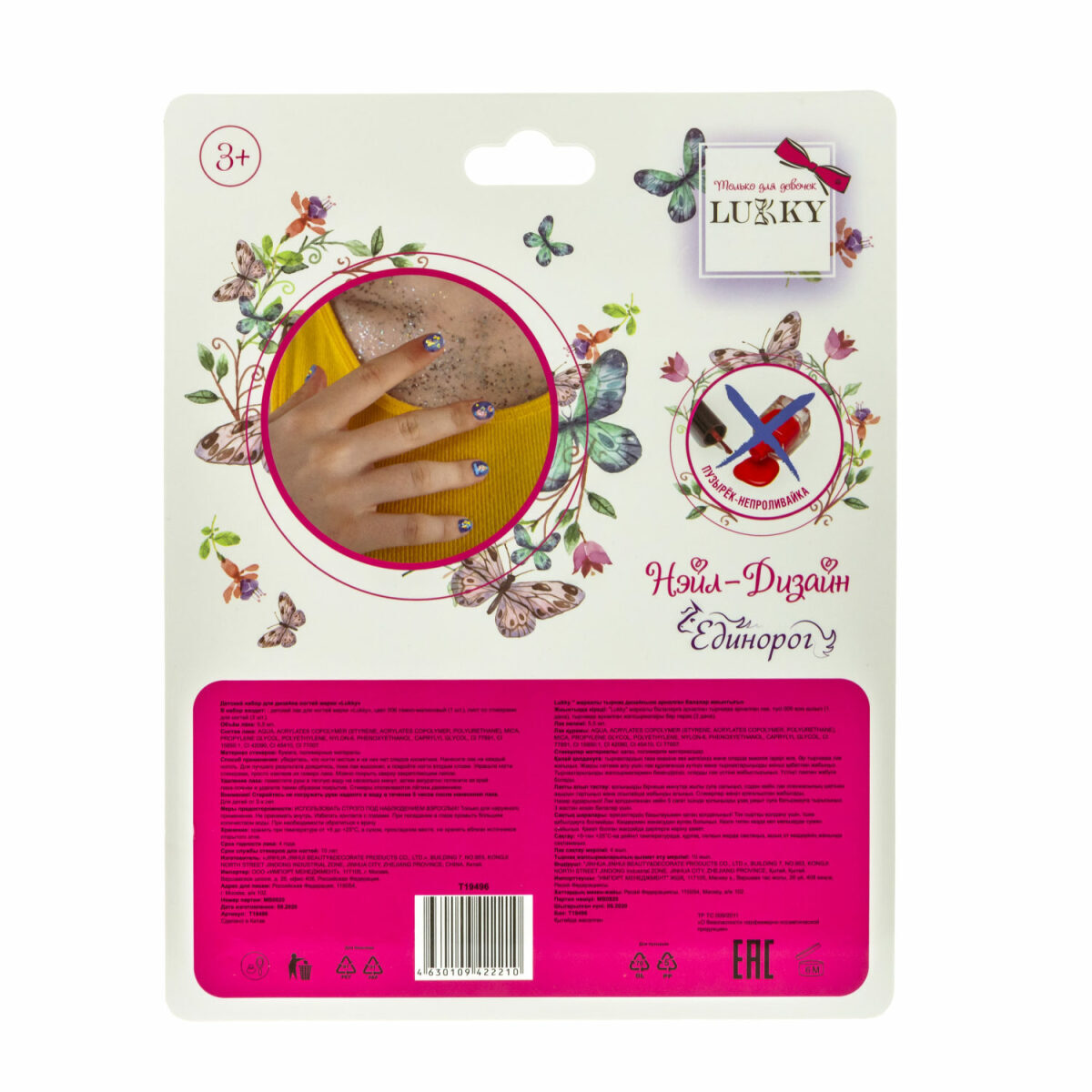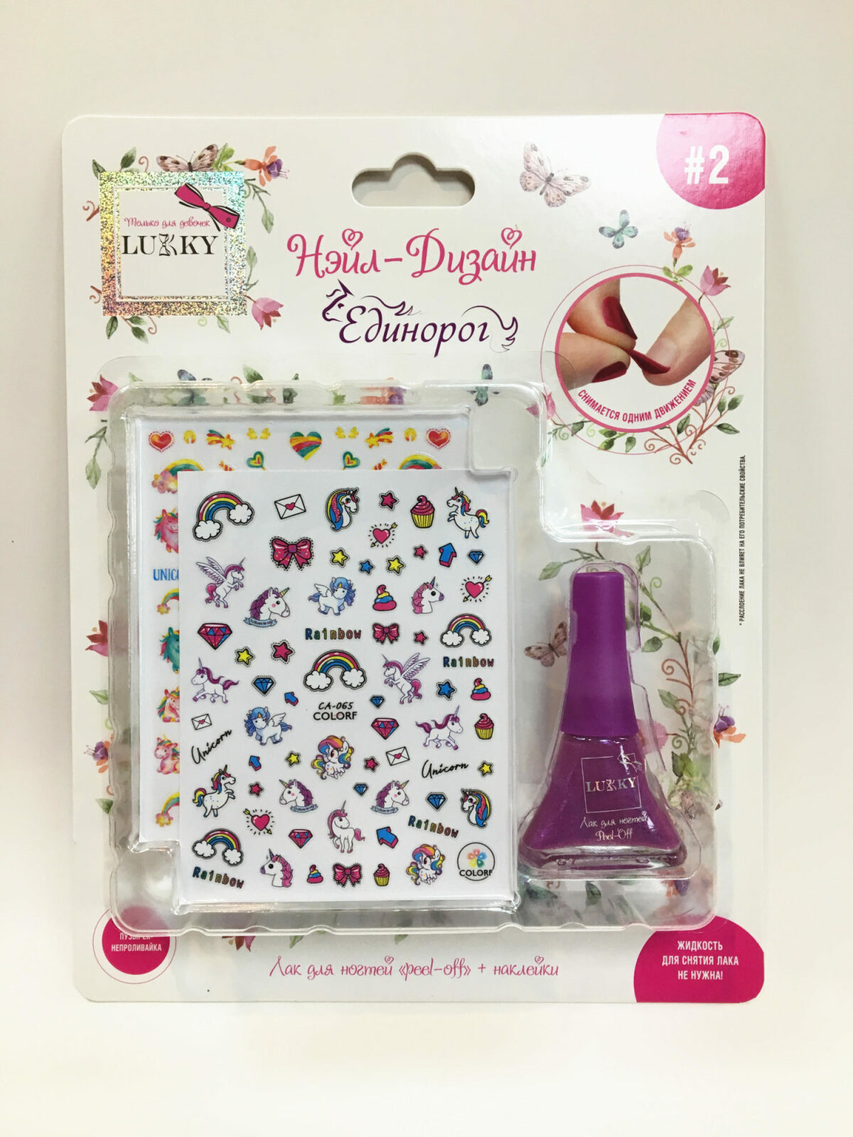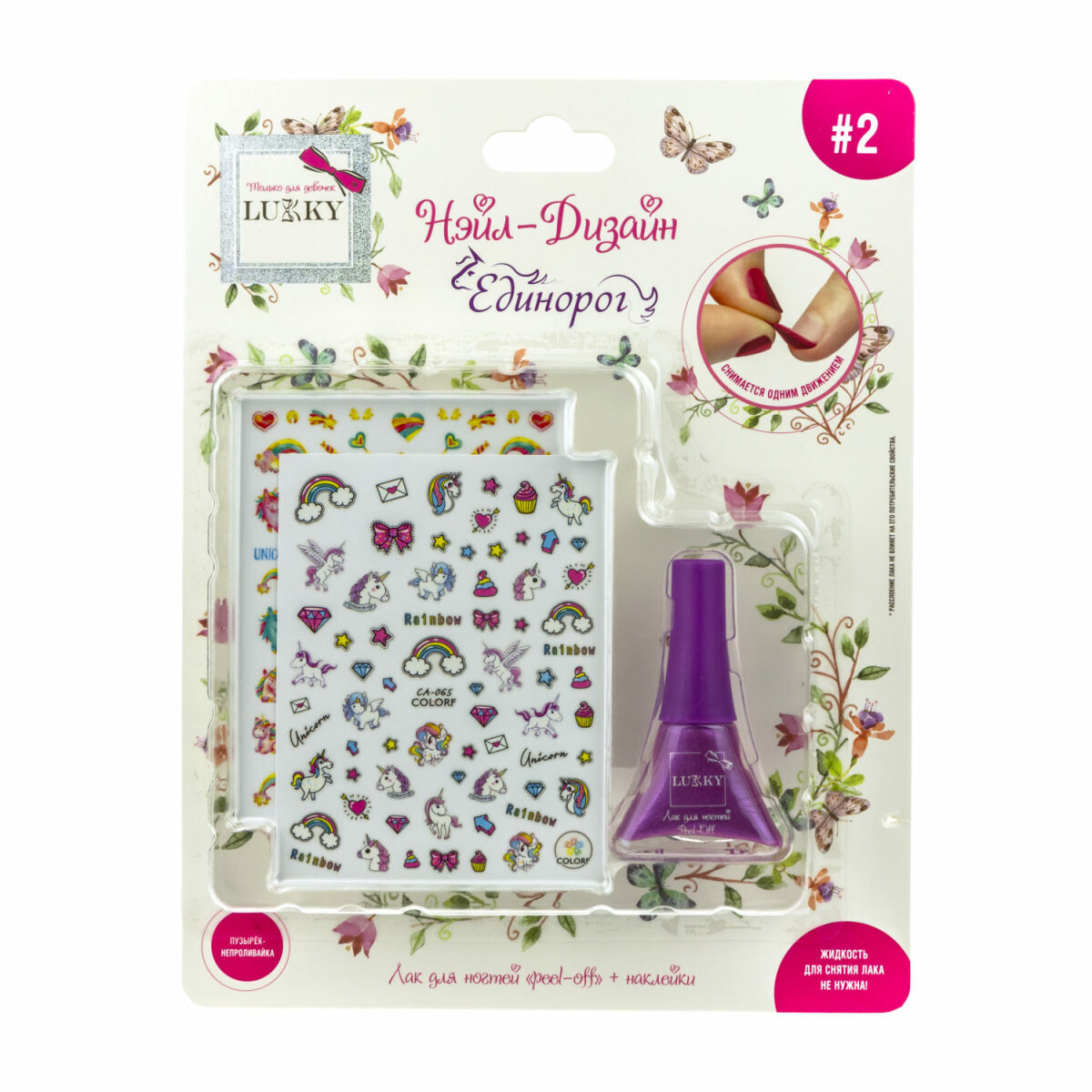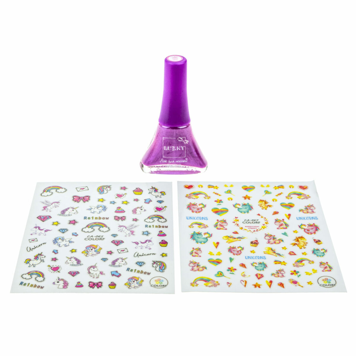 Набор LUKKY "Нэйл-Дизайн" #2, лак для ногтей ежевичный+наклейки "Единорог"