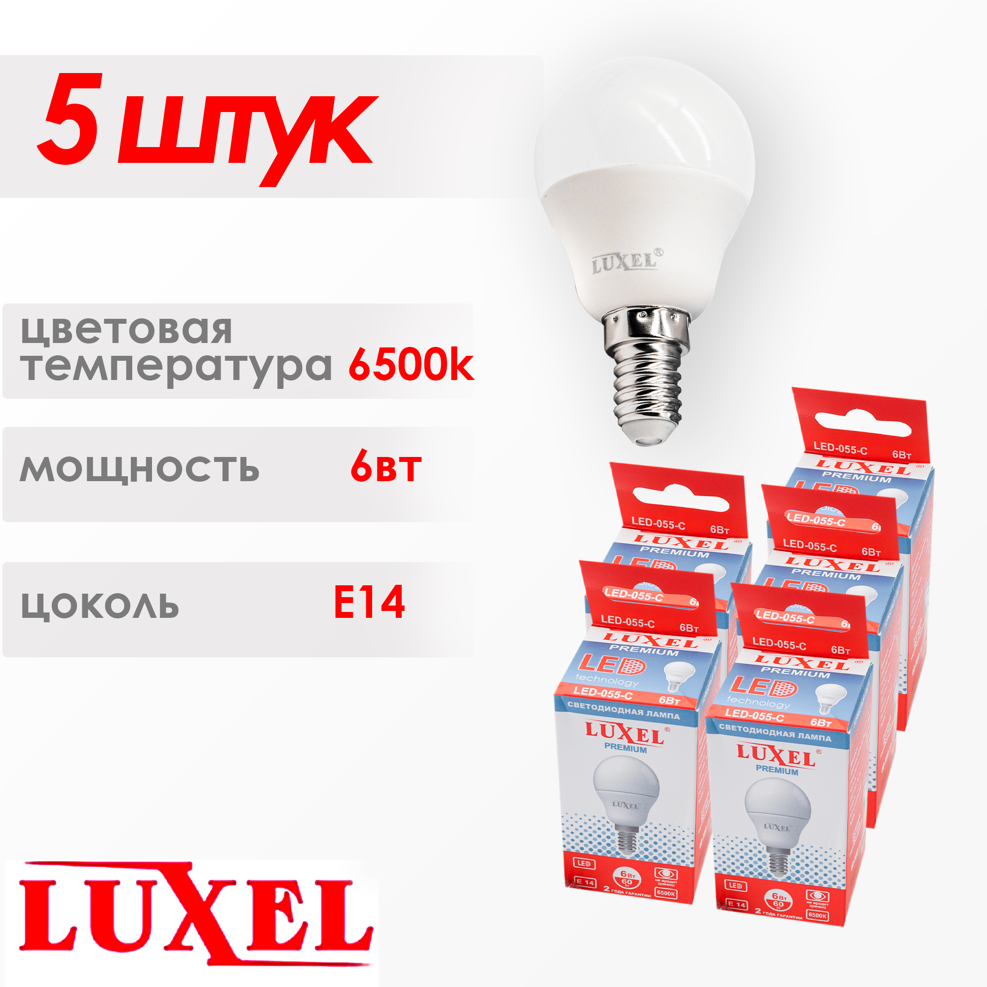 Лампочка LUXEL 055-С-5, Холодный белый свет, E14, 6 Вт, Светодиодная, 5 шт.