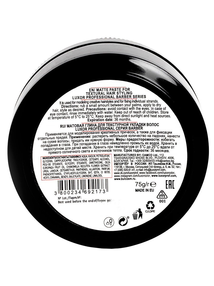 LUXOR PROFESSIONAL MATTE PASTE Матовая паста (Глина) для текстурирующей укладки волос, 75 грамм, Болгария