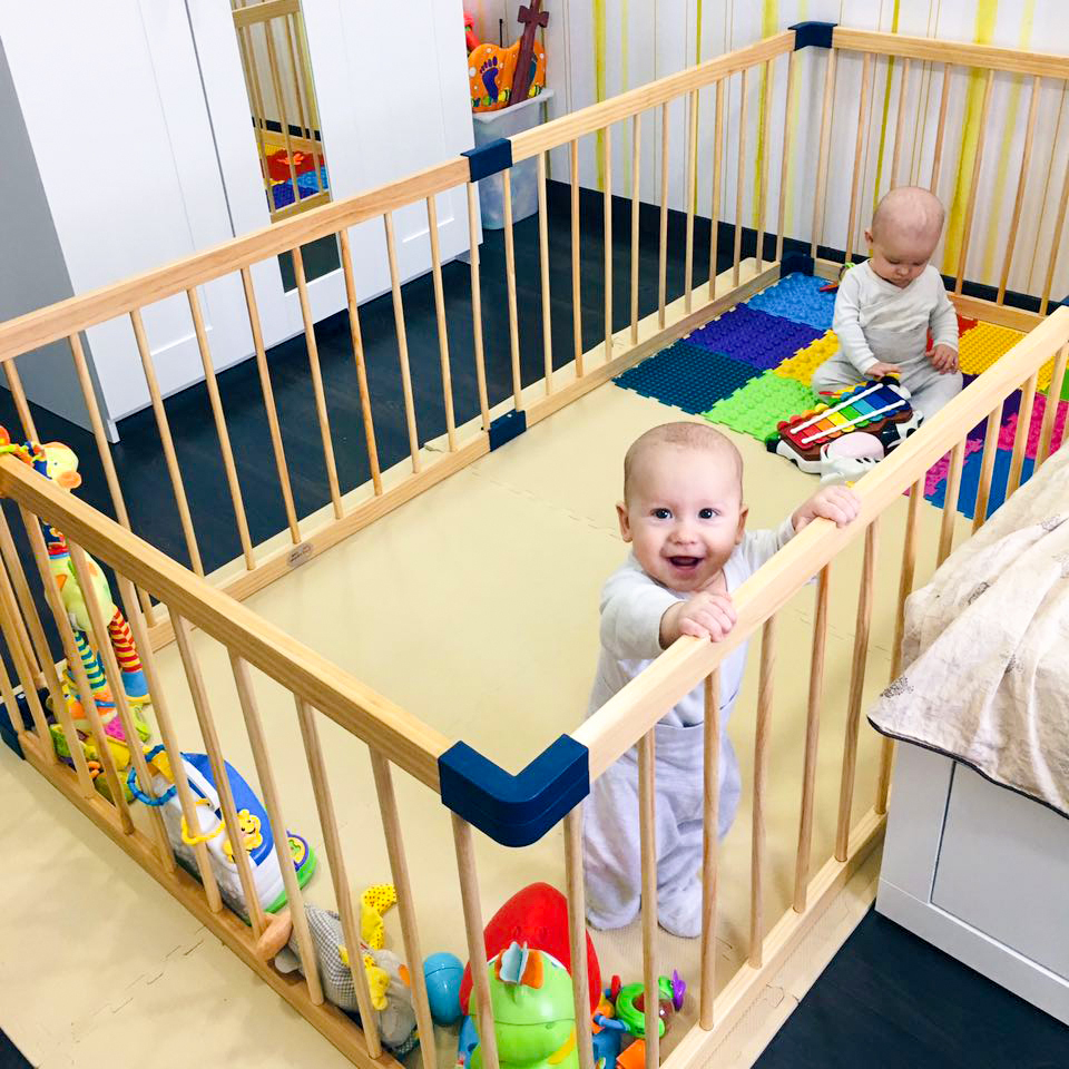 Деревянный манеж ограждение LYALYALUX, SL-133-8XPE40GW, 2.22x2.22 м, 8 секций, белые-серые коврики