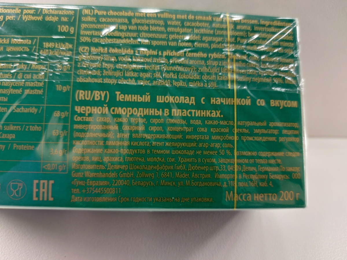 Темный шоколад с начинкой со вкусом черной смородины в пластинках 2 штуки, 400 грамм