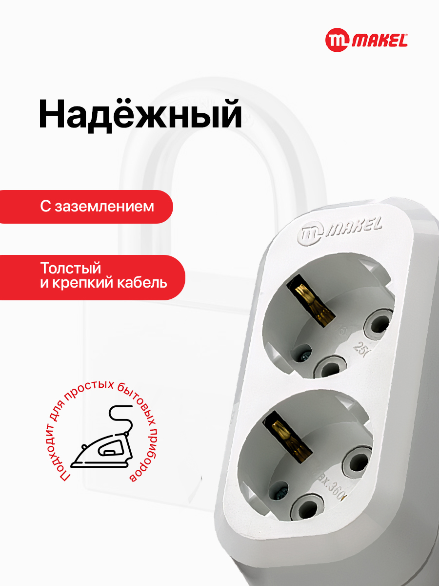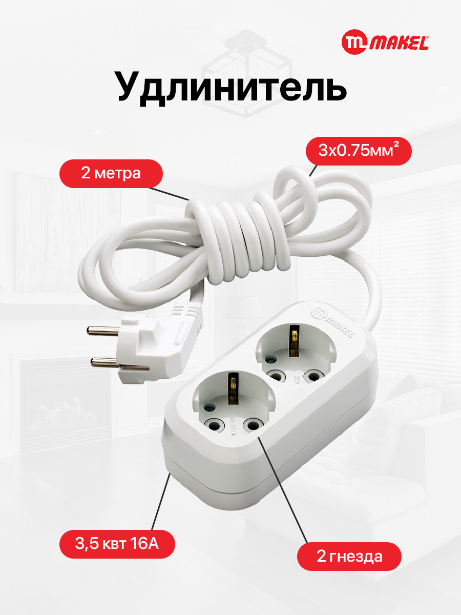 Сетевой удлинитель MAKEL MGP112 2 гнезда 2 метра с заземлением