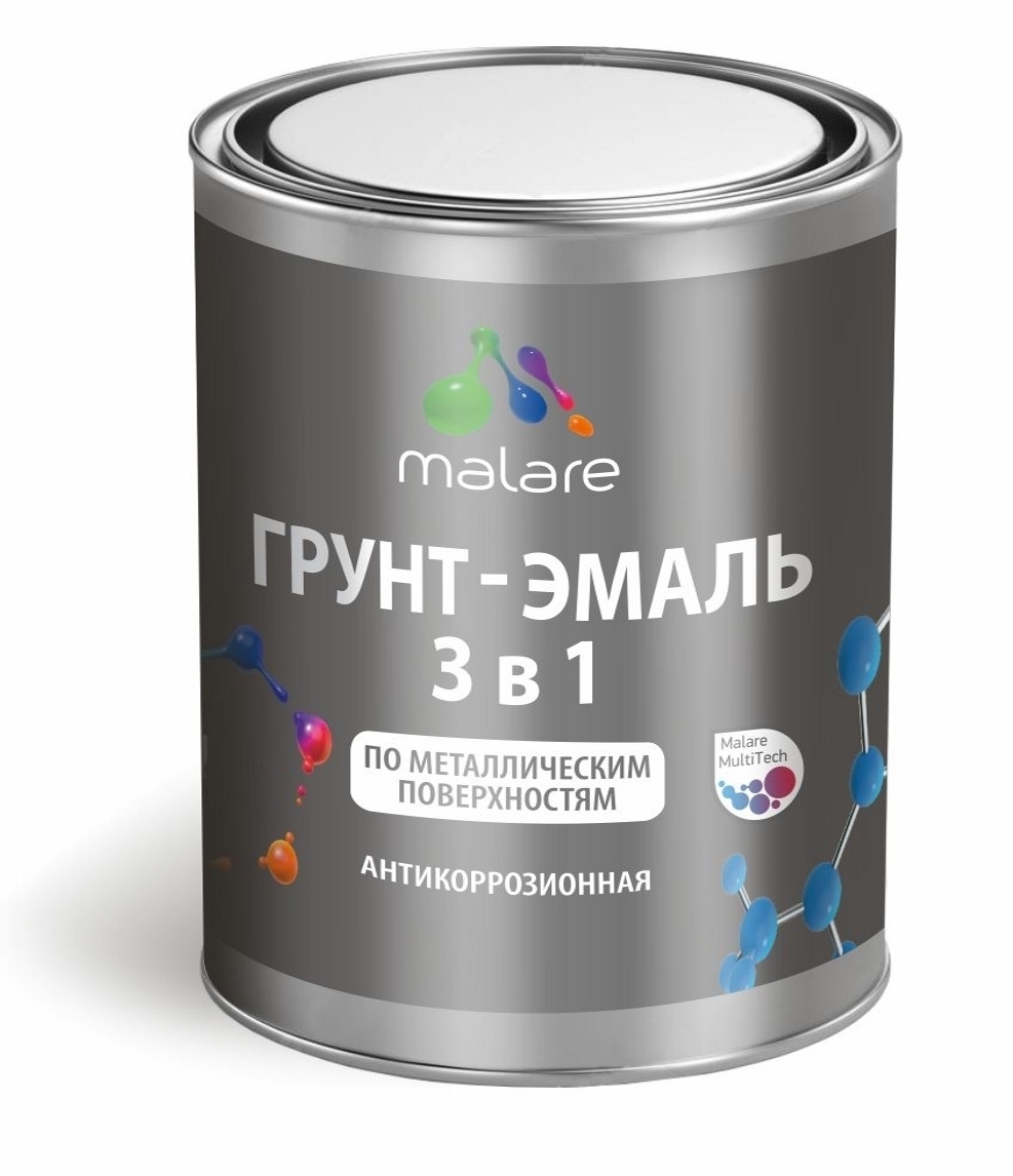 Грунт-эмаль, Краска Malare Антикоррозионная 3 в 1 Быстросохнущая, Акриловая, Глянцевое покрытие, 1 кг, белый