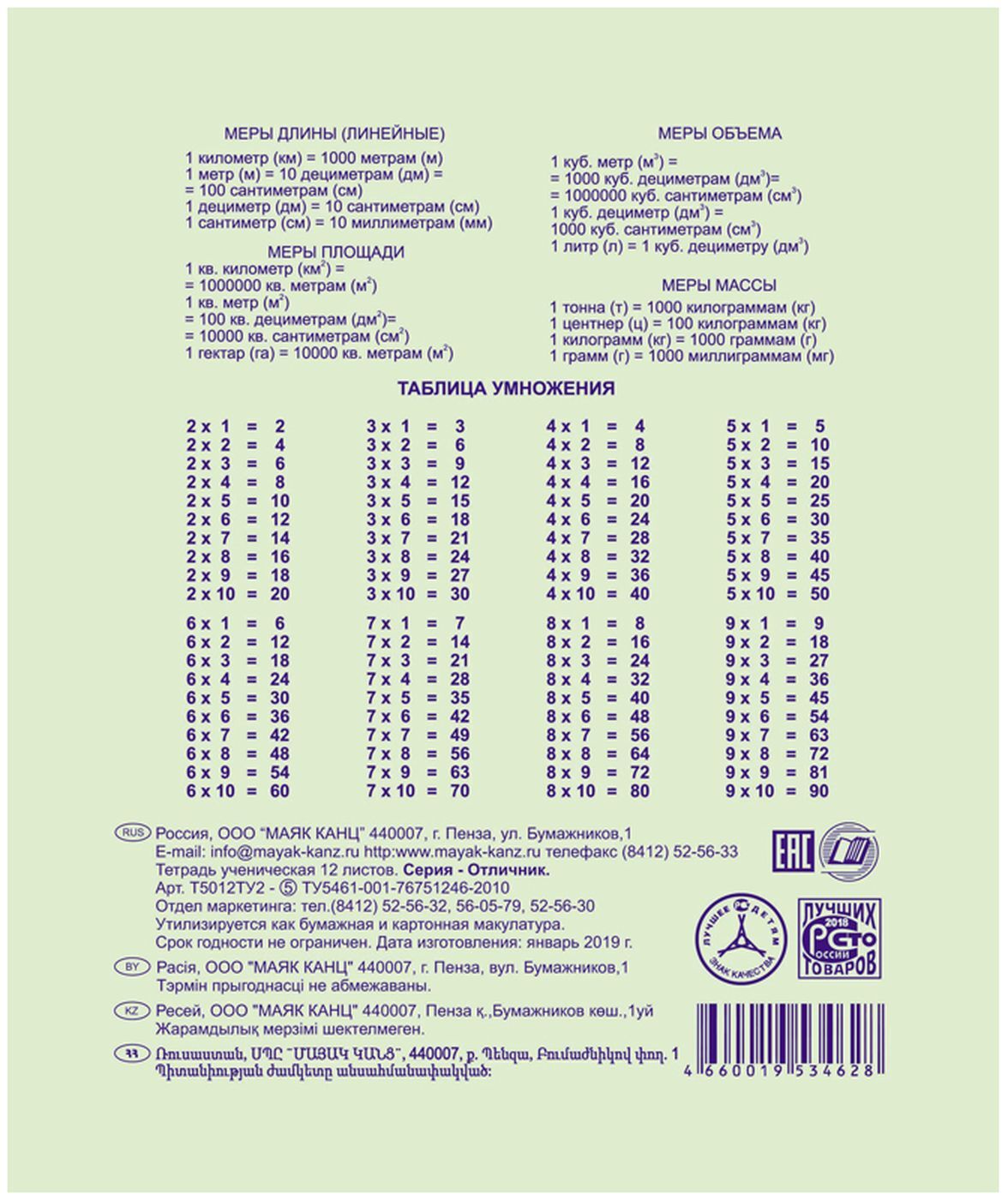 Тетрадь Маяк Отличник, в клетку, Т5012 ТУ2 ЗЕЛ 5Г, зеленый, 12 листов х 20 шт