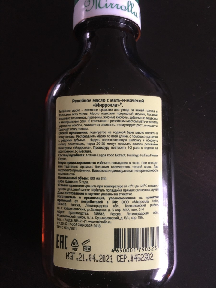 Mirrolla Репейное масло с Мать-и-Мачехой для укрепления и роста волос, 100 мл
