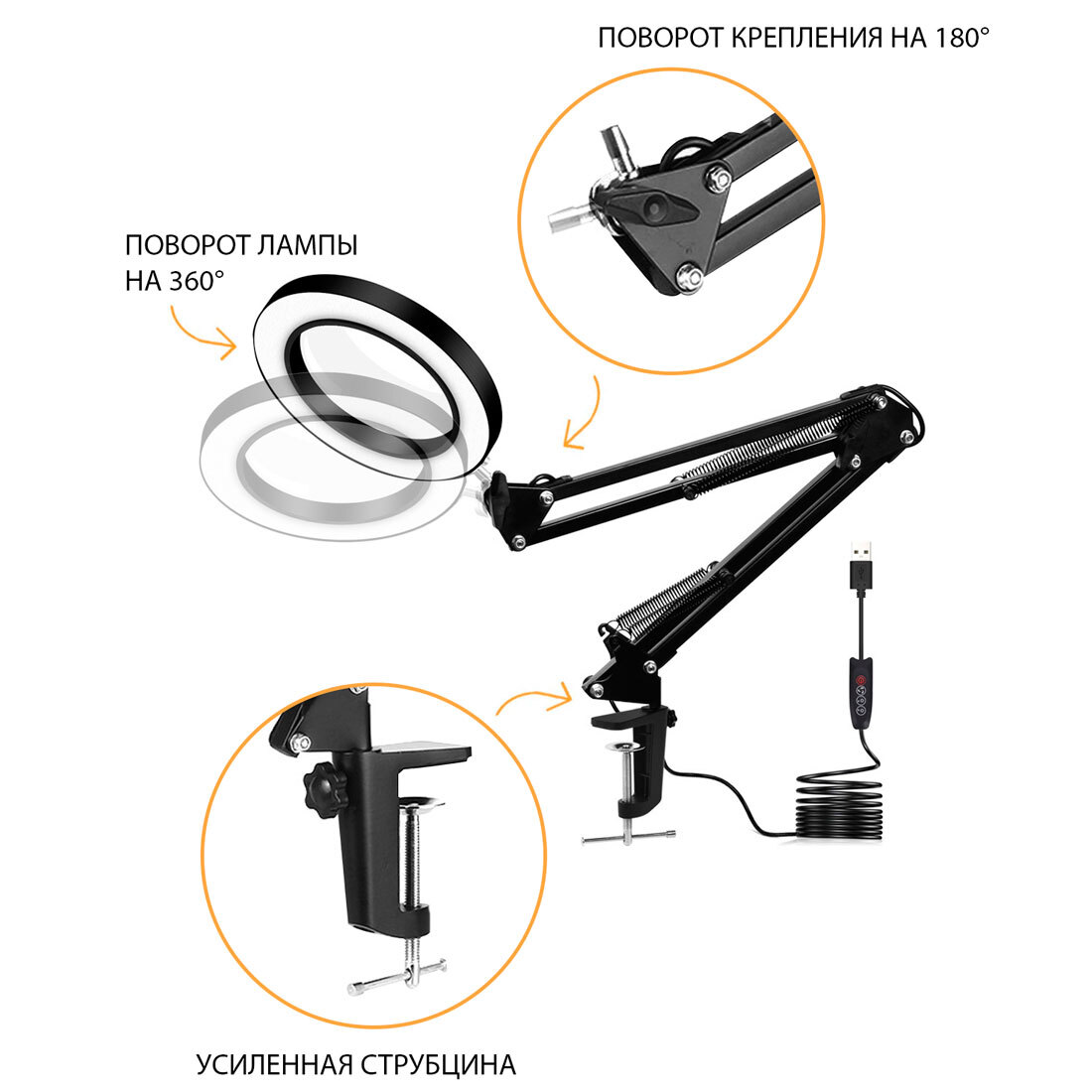 Лампа лупа светодиодная LN-22 на струбцине, настольная, черная