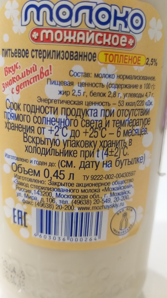Молоко Можайское молоко, топленое, стерилизованное 2.5%, 450 мл
