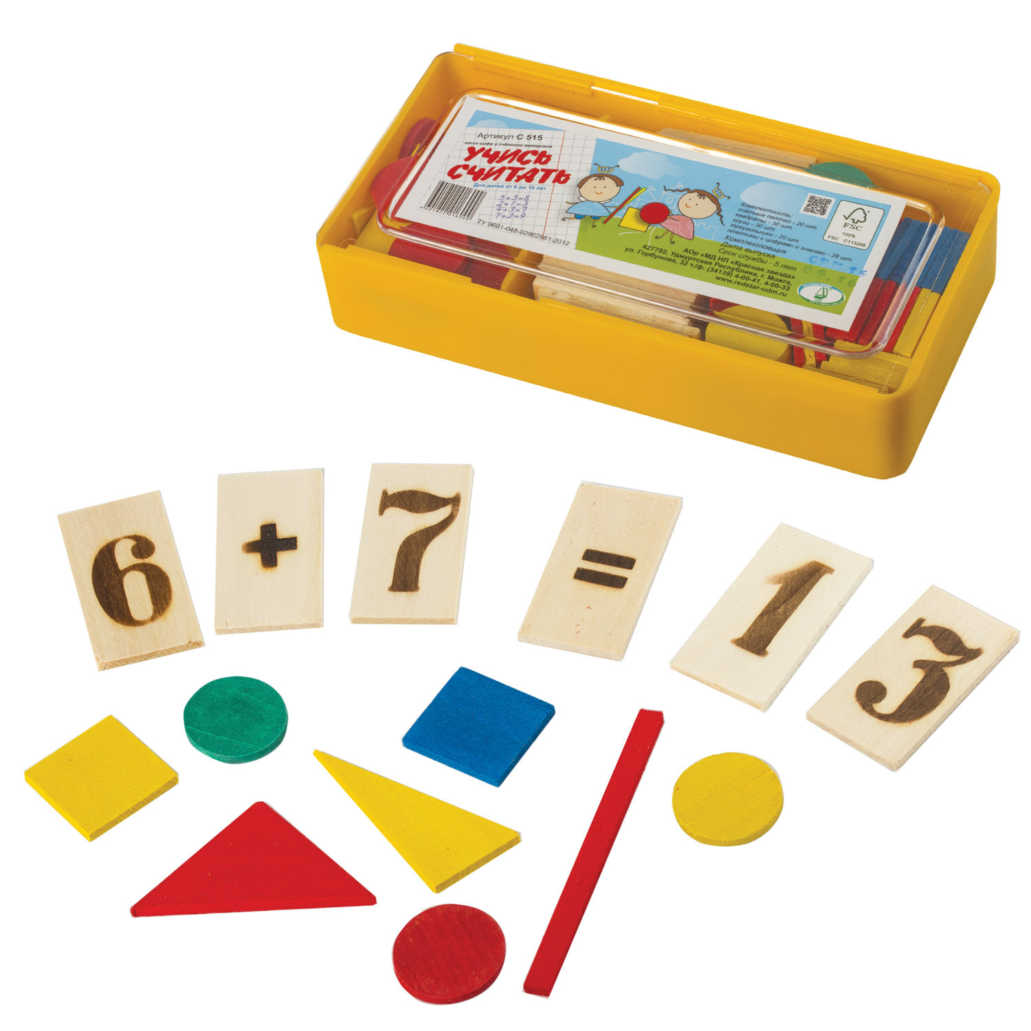 Касса цифр и счетного материала из натурального дерева "Учись считать", 128 предметов, пенал, С 515