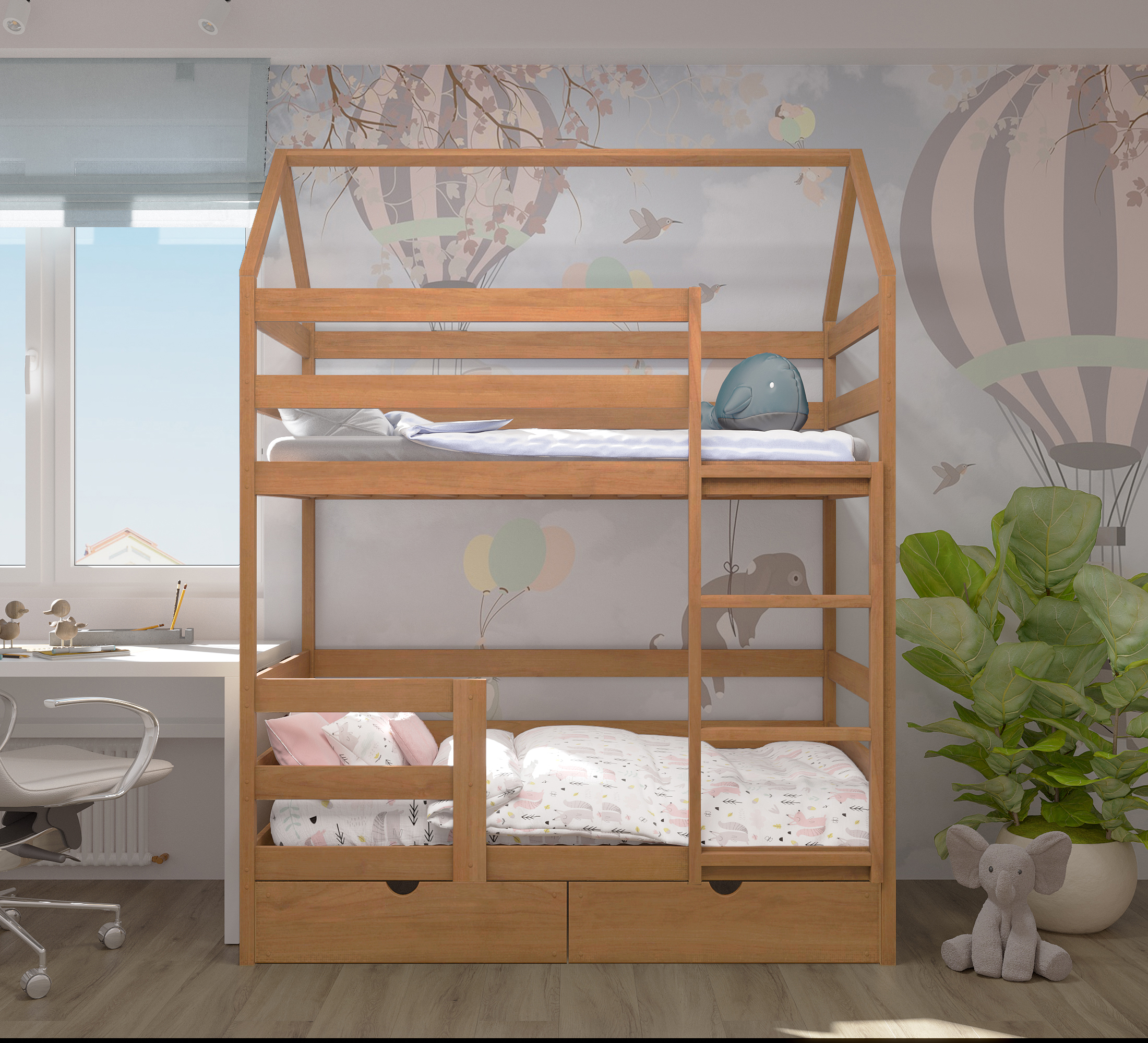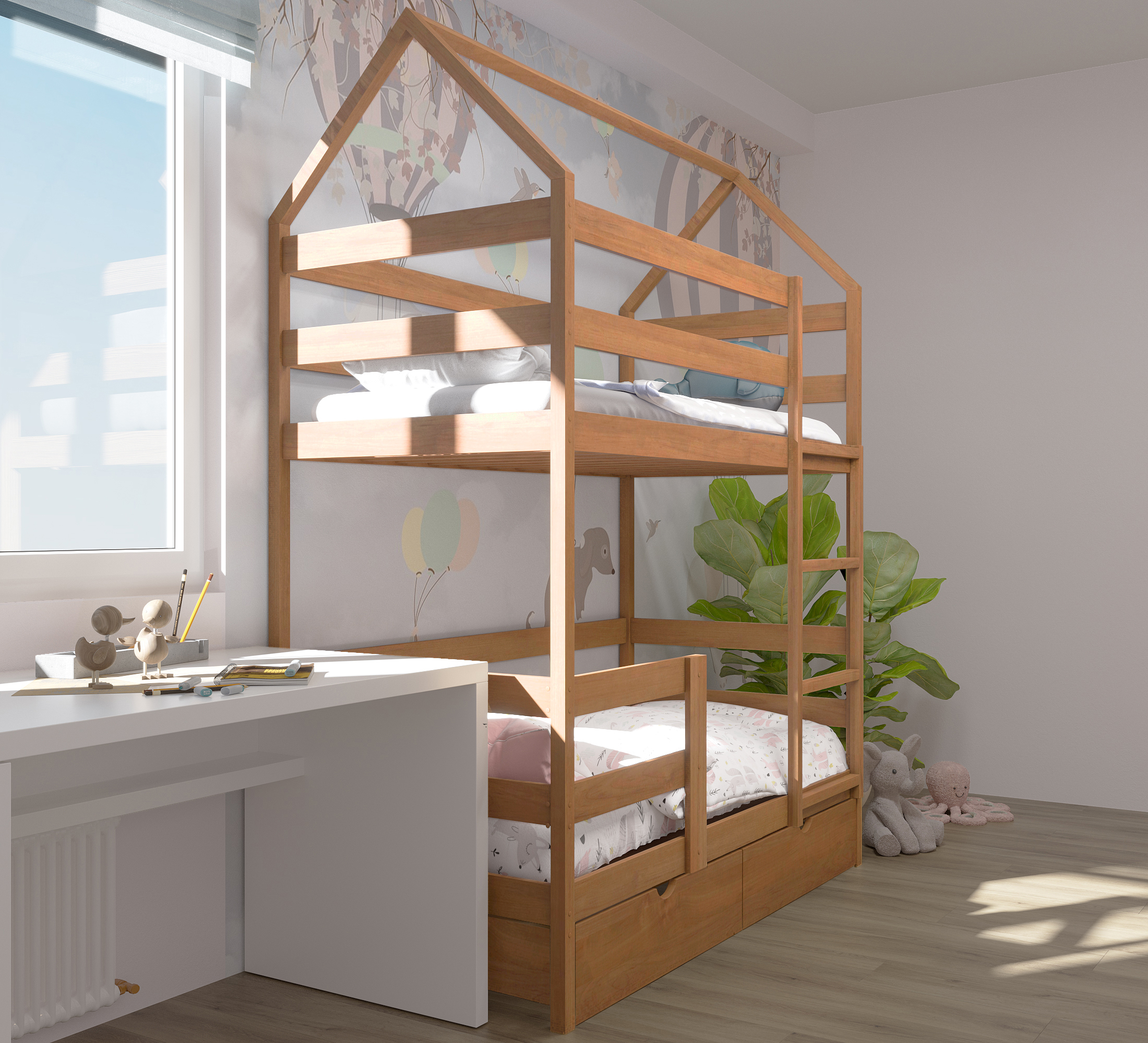 Двухъярусная кровать MOONWOOD Двухъярусная с лестницей-комодом, 180х90, белая, из массива берёзы, 239х96х215 см
