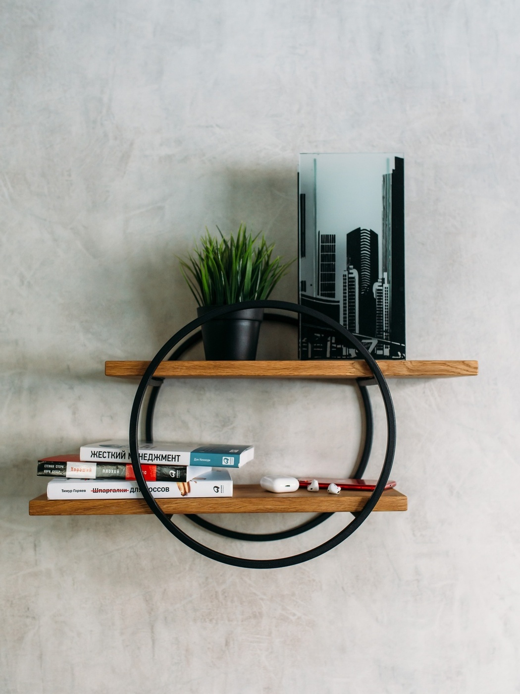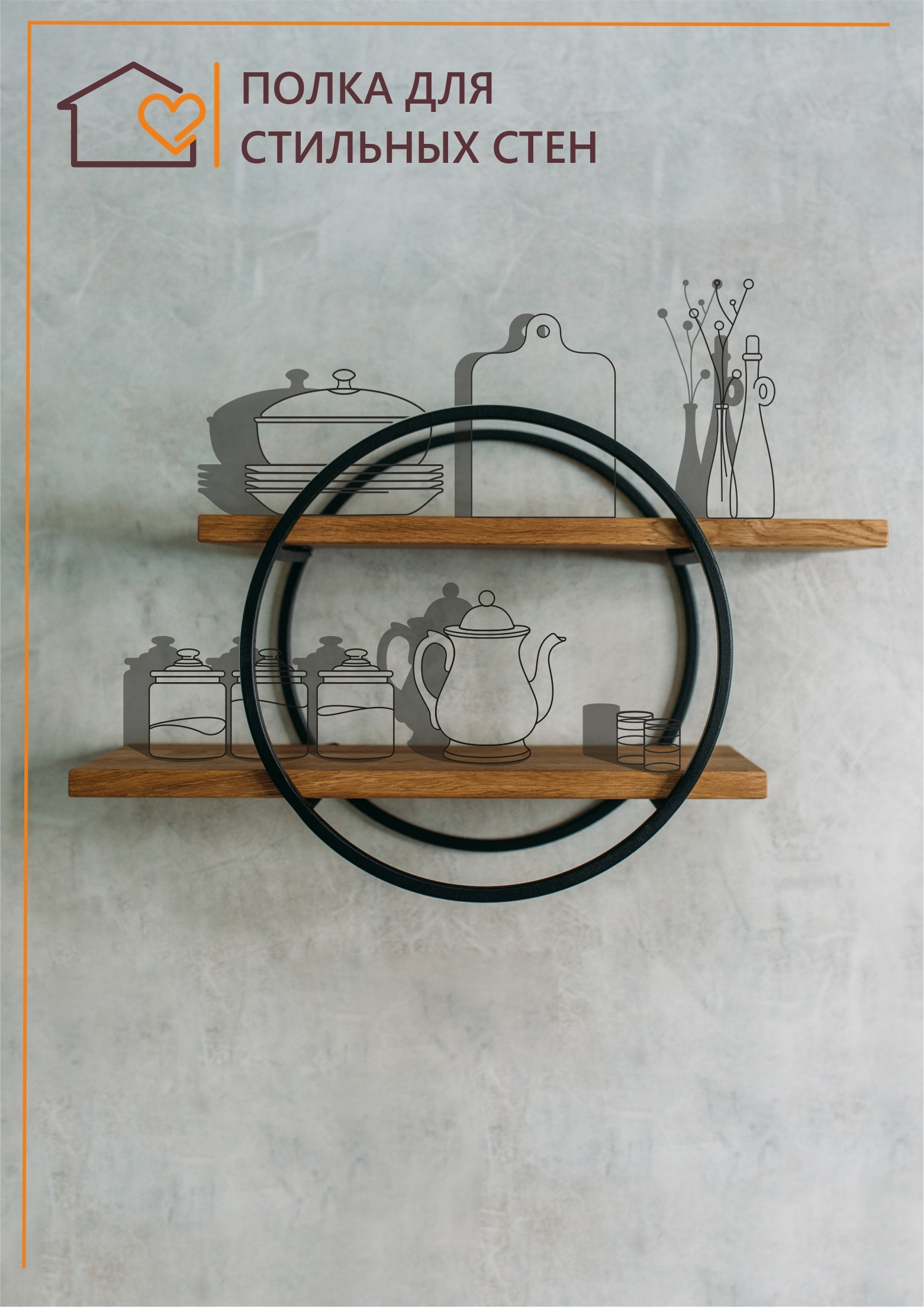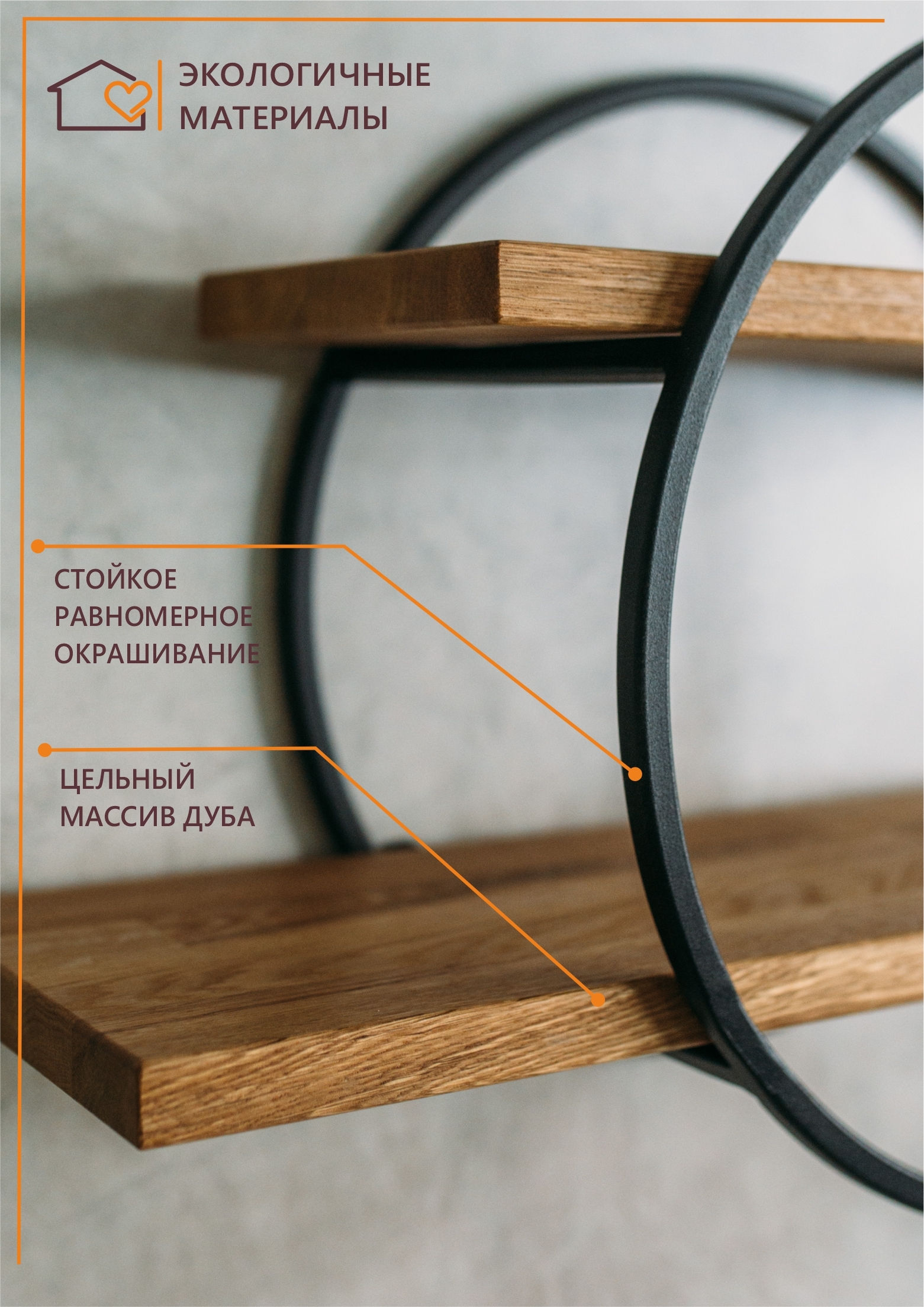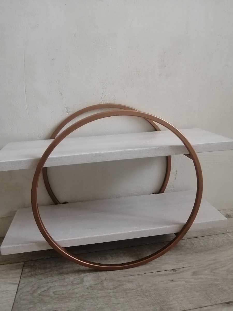 Полка MoreThanHome Настенная Прямая массив дуба, 2х уровневая для цветов, Круг медный металл, навесная, 50.0х16.8х35.0 см, 1 шт.