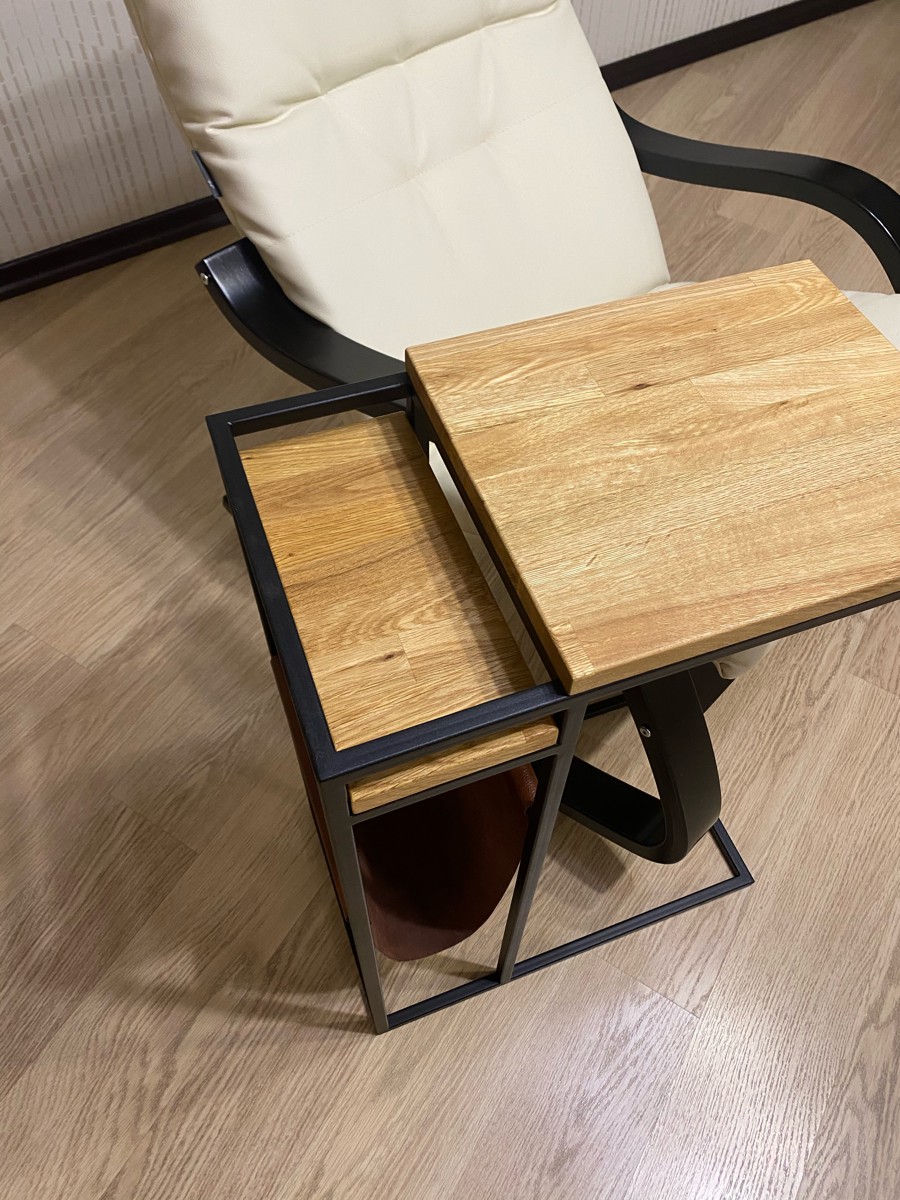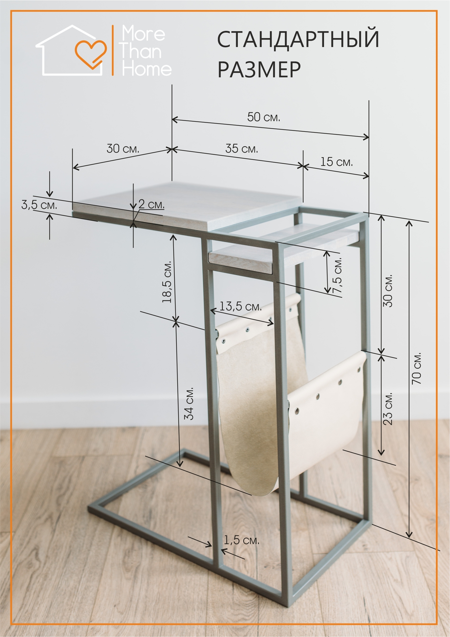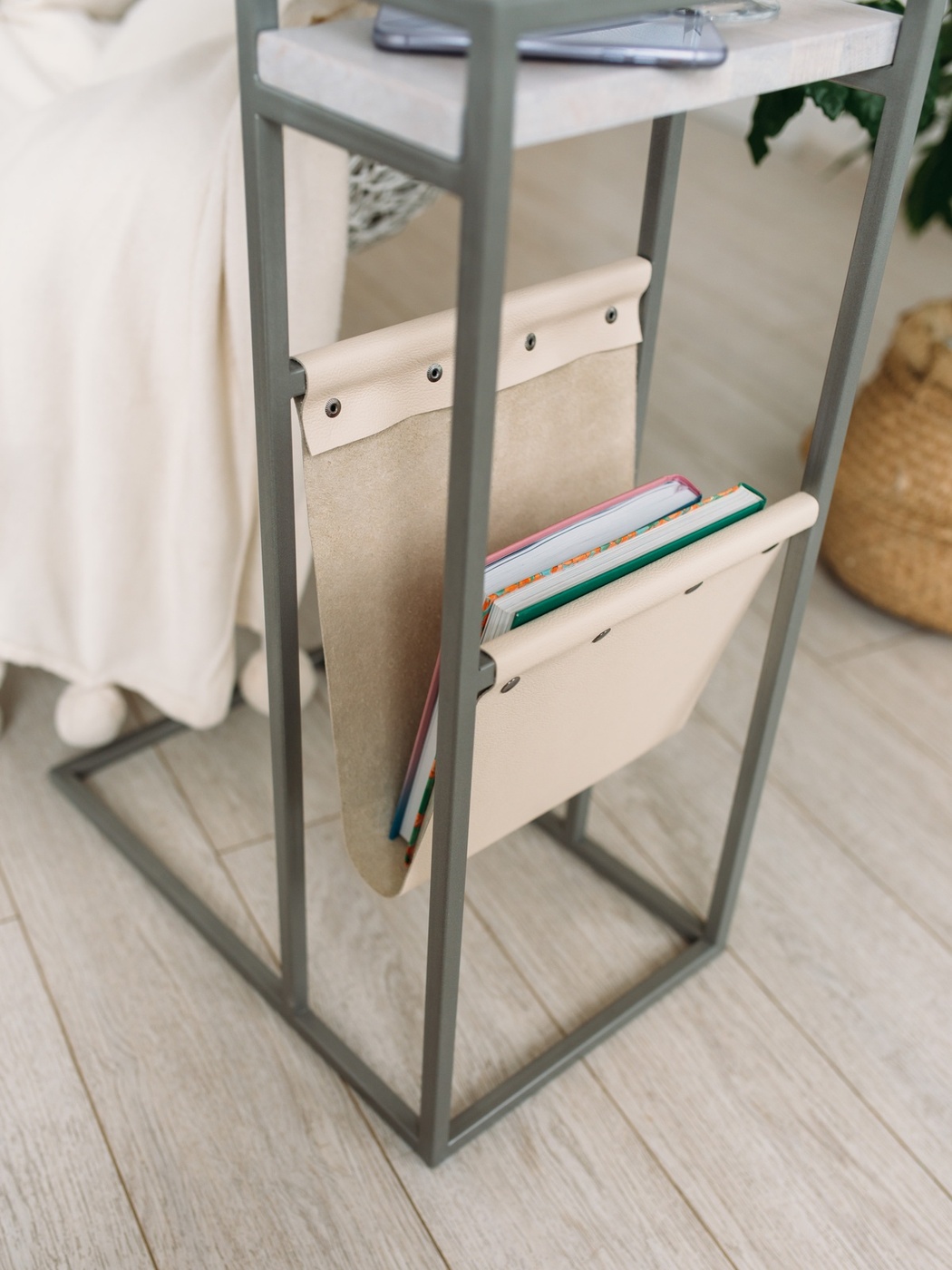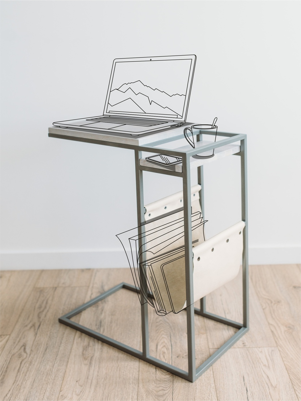 Приставной столик MoreThanHome с кожаным карманом, мраморный рисунок/серый металл, столик к дивану для ноутбука, 30х50х70 см