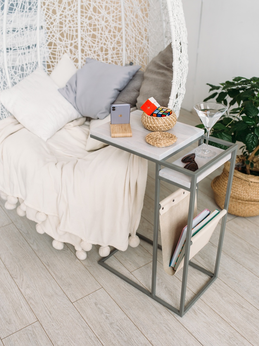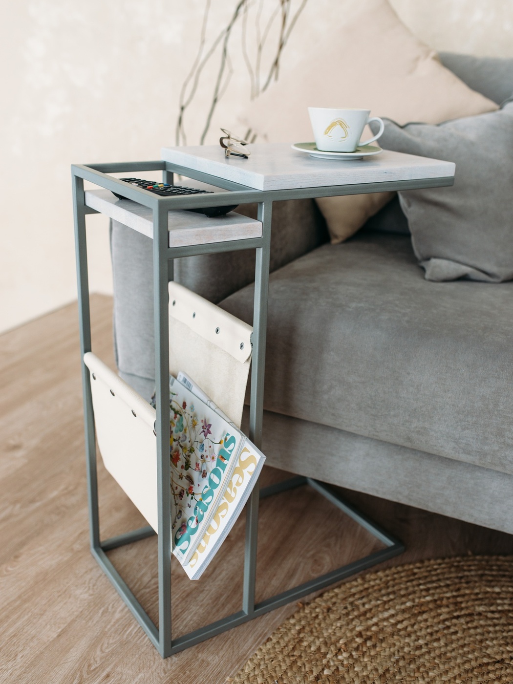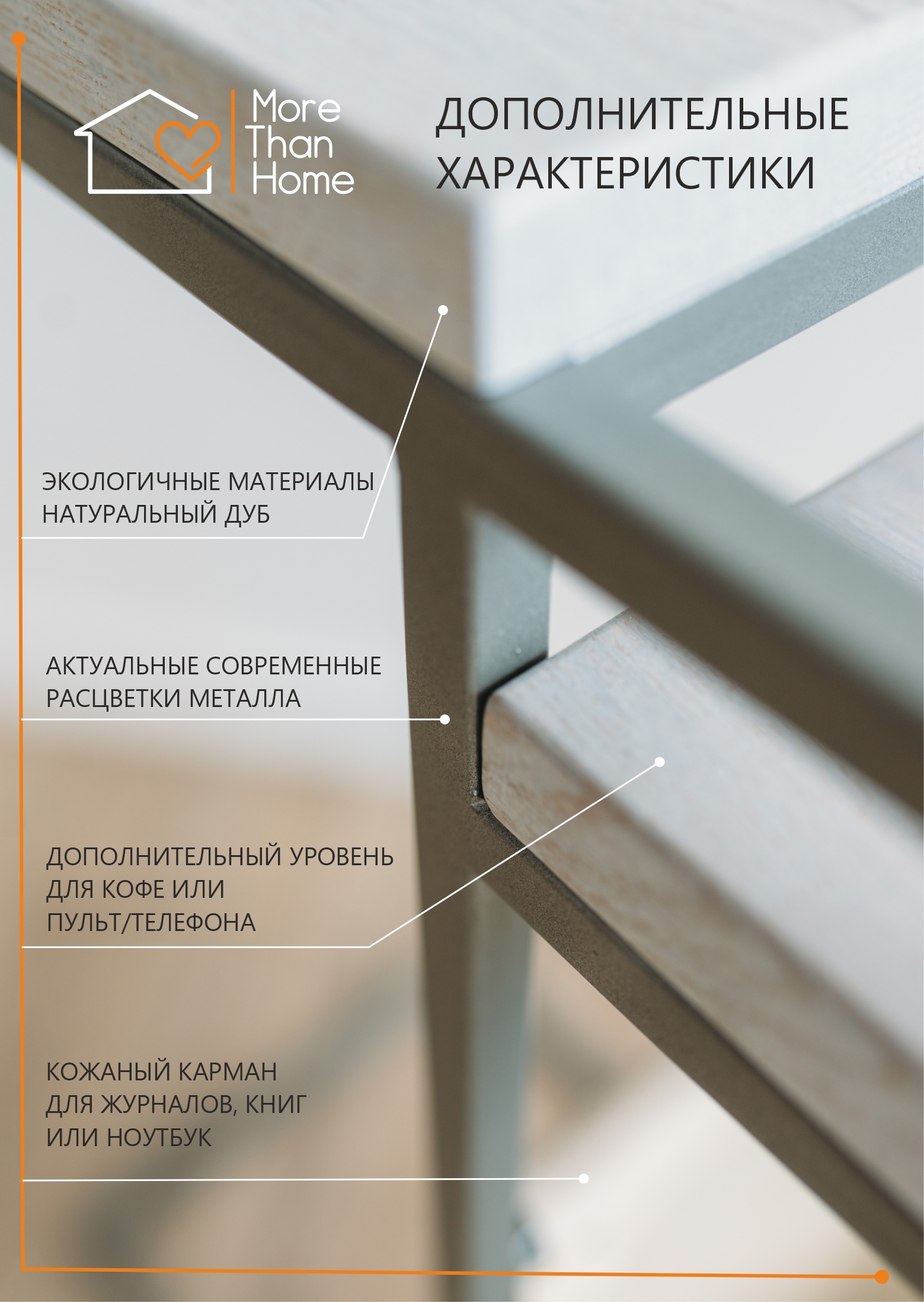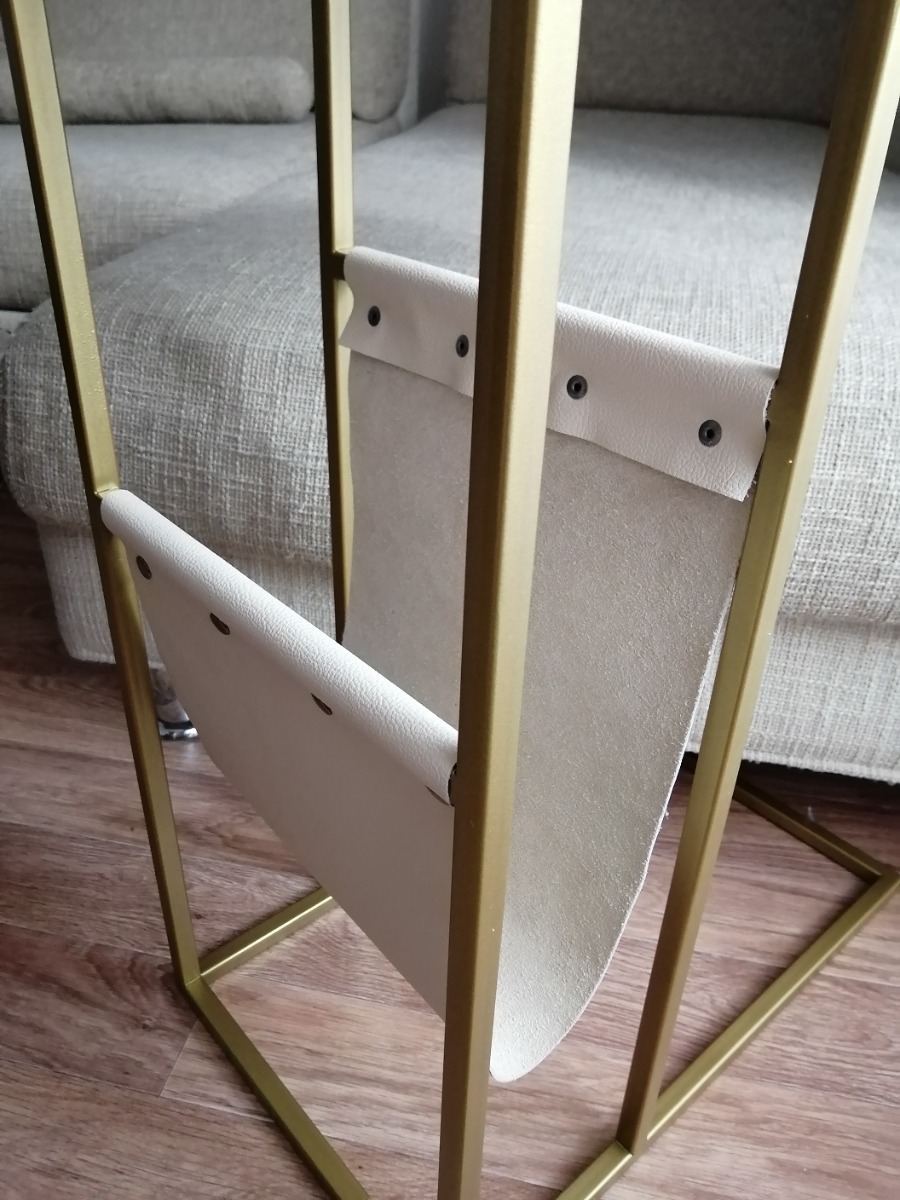 Приставной столик MoreThanHome с кожаным карманом, мраморный рисунок/серый металл, столик к дивану для ноутбука, 30х50х70 см