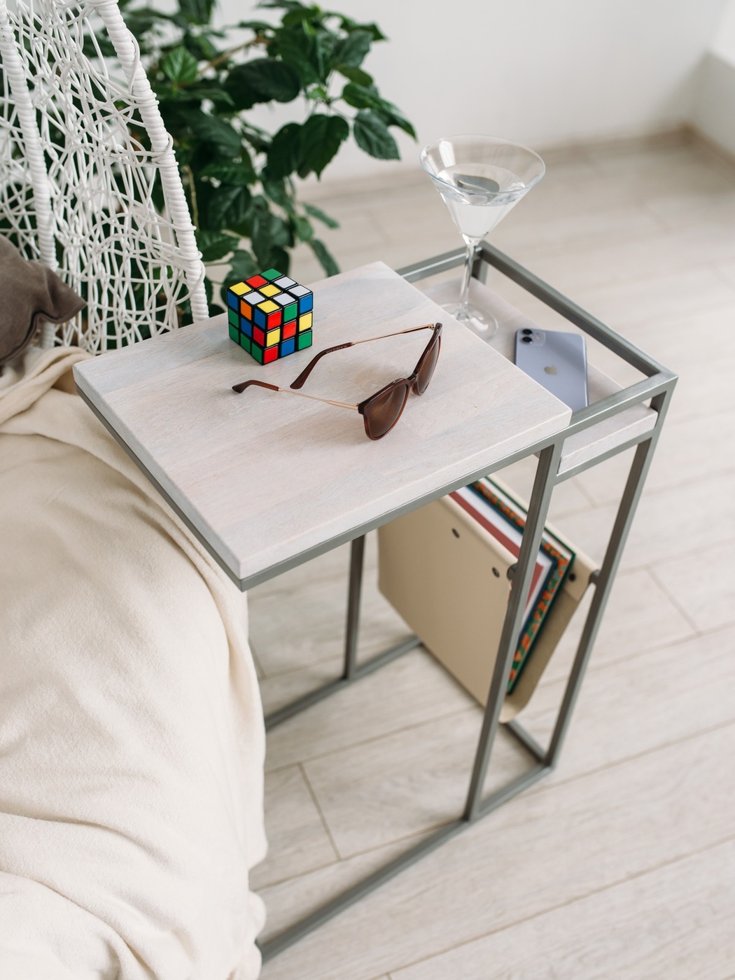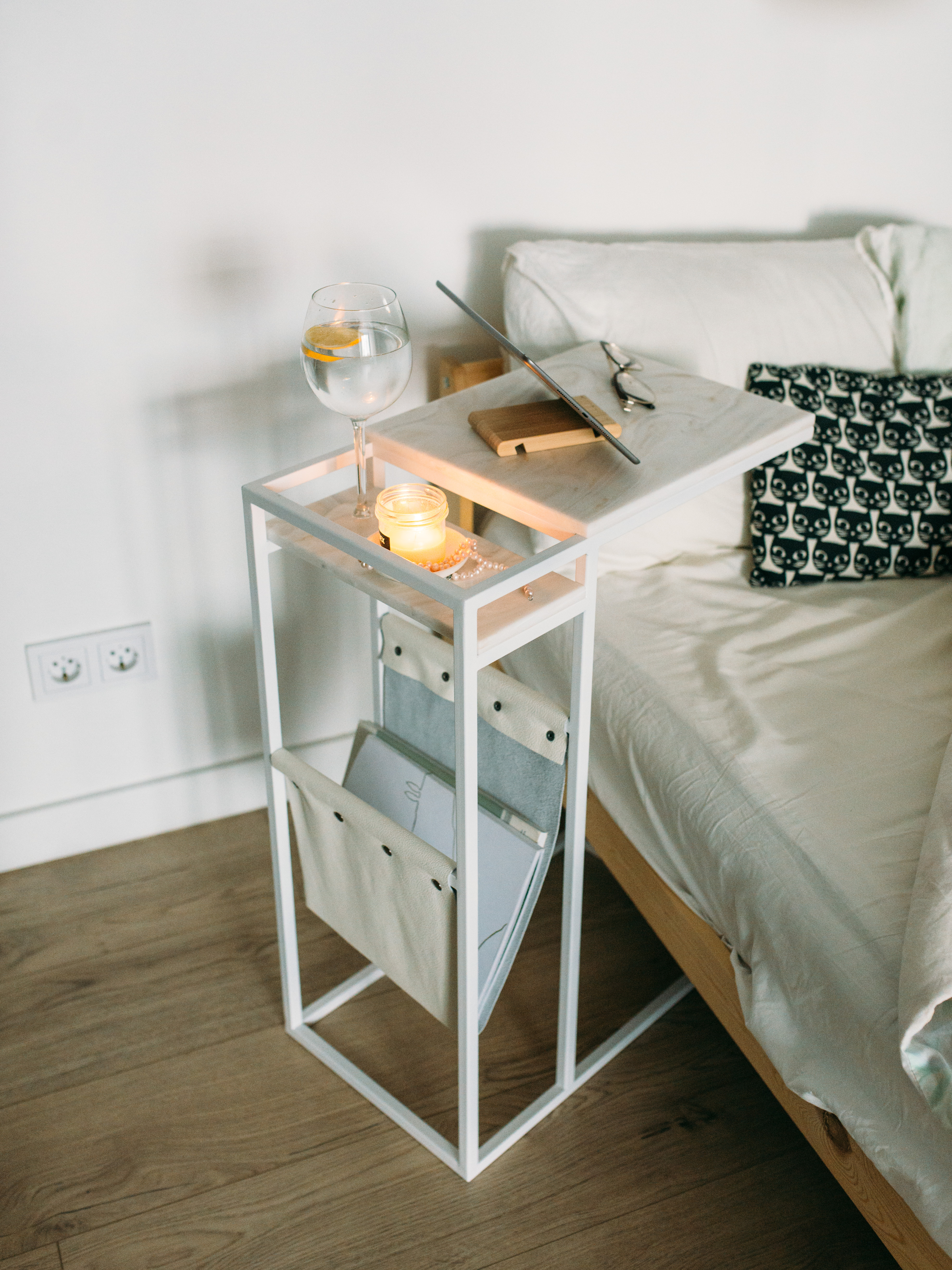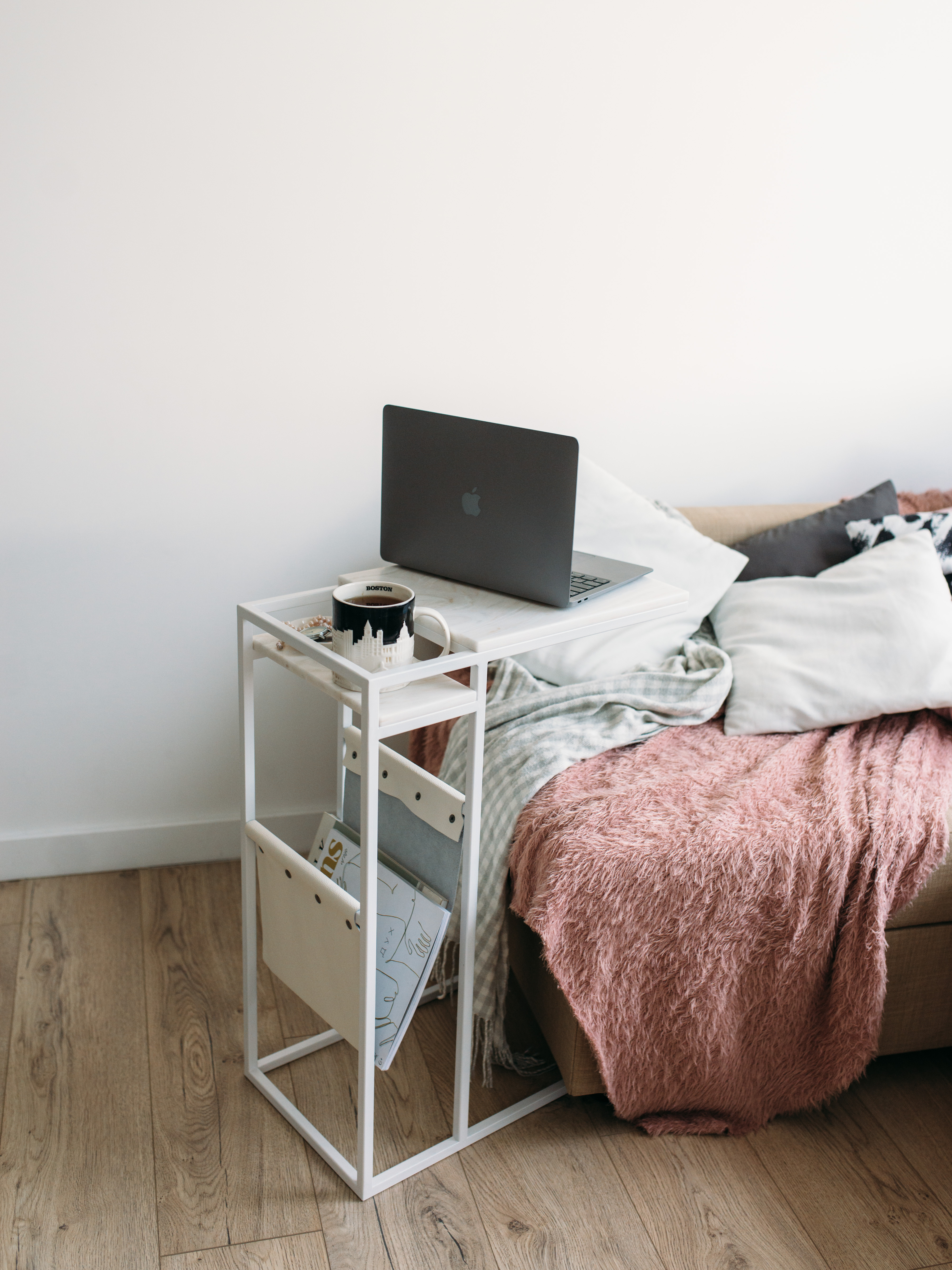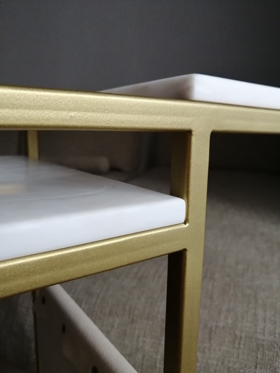 Приставной столик MoreThanHome с кожаным карманом, мраморный рисунок/серый металл, столик к дивану для ноутбука, 30х50х70 см