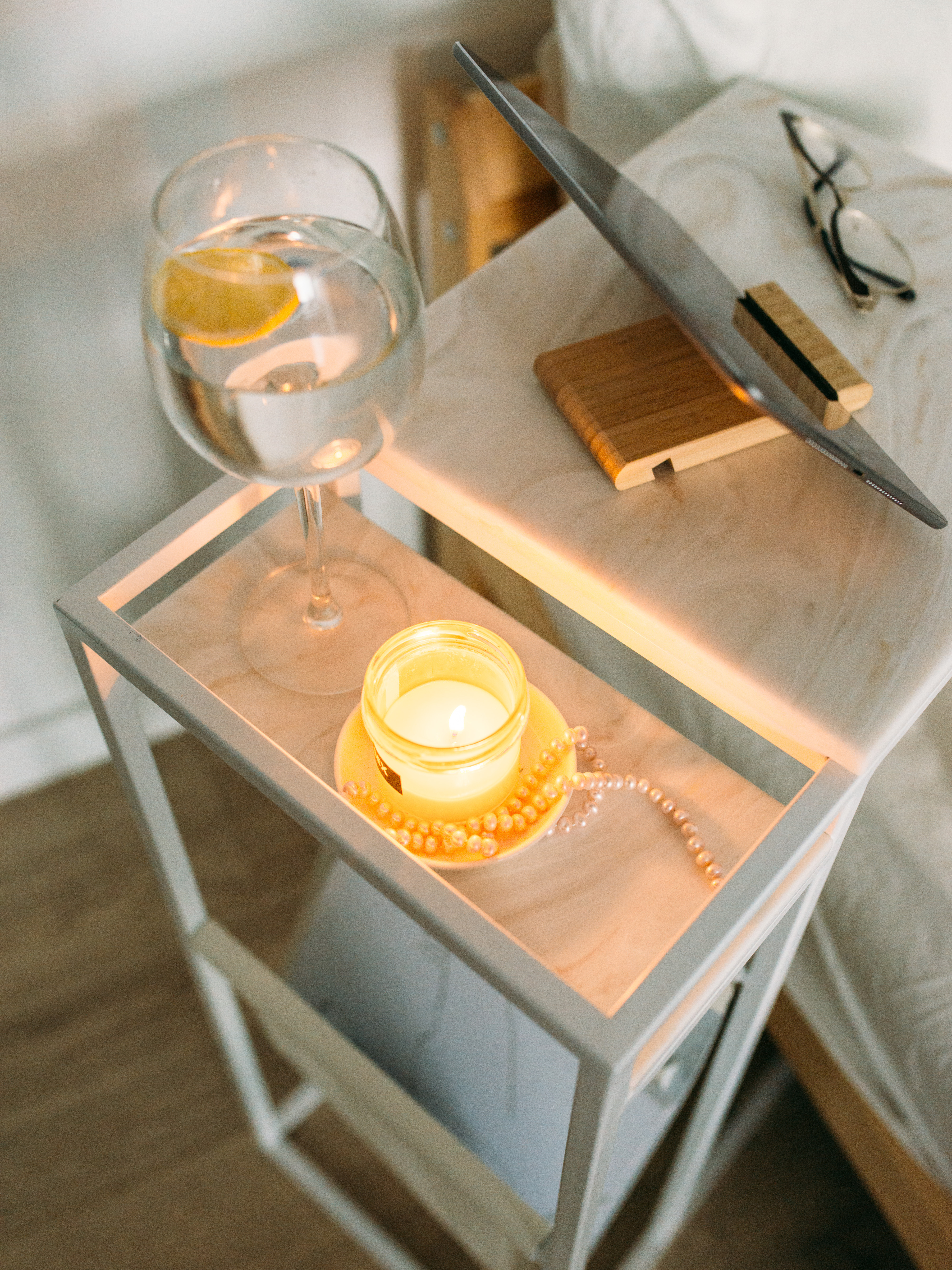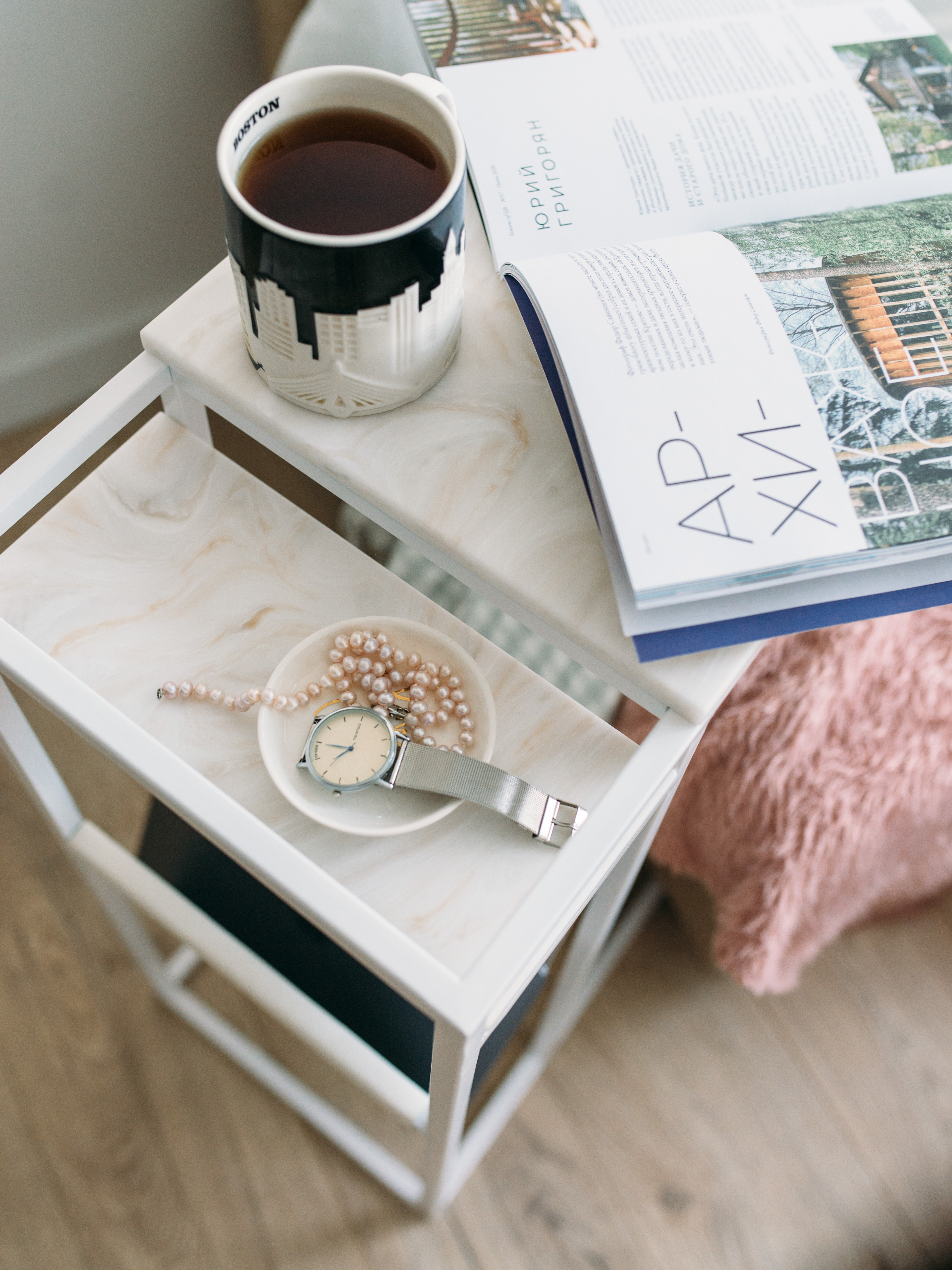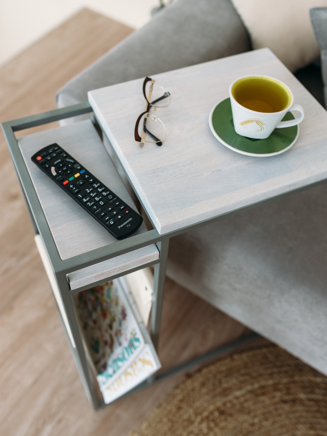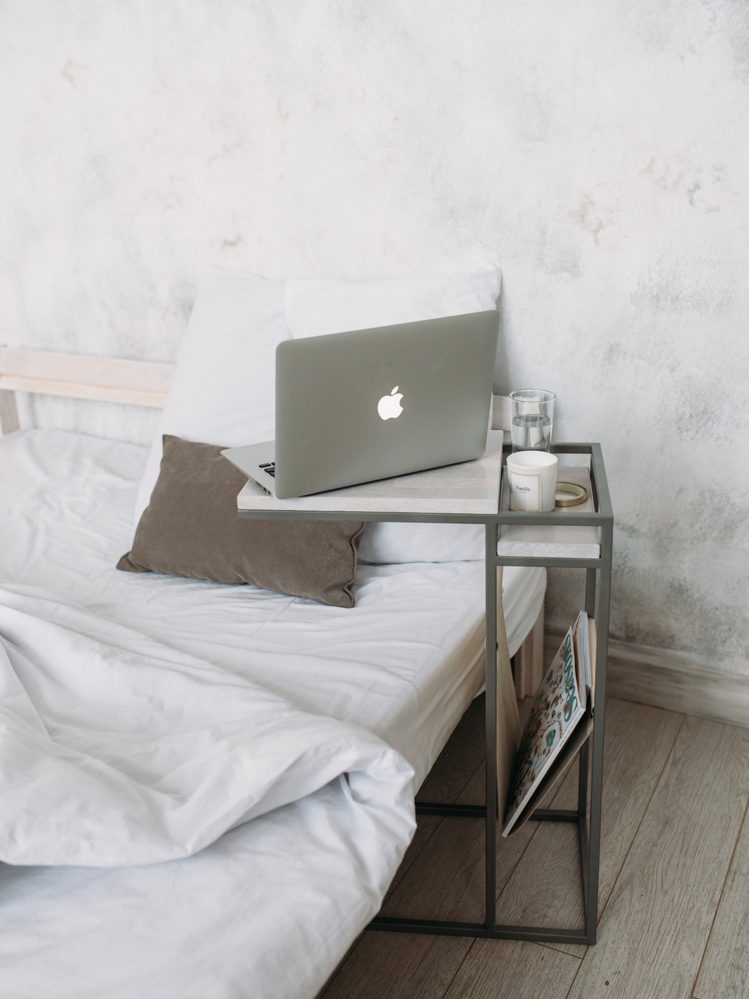 Приставной столик MoreThanHome с кожаным карманом, мраморный рисунок/серый металл, столик к дивану для ноутбука, 30х50х70 см