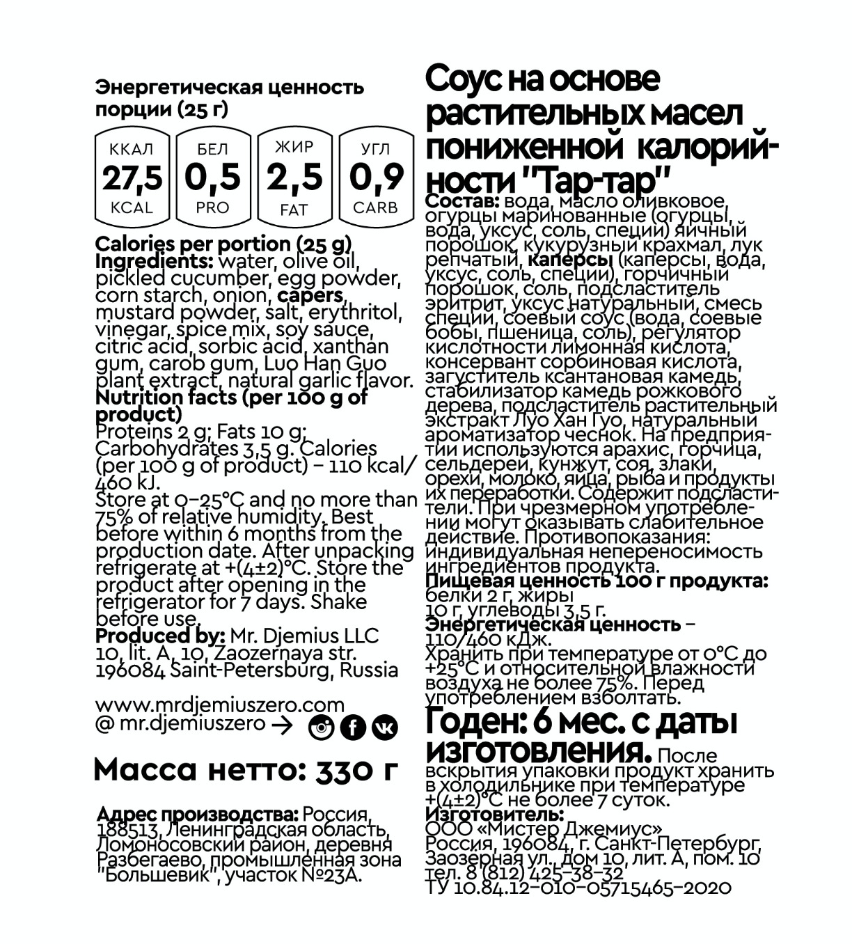 Соус пониженной калорийности Mr.Djemius ZERO "Тар-тар" 330гр