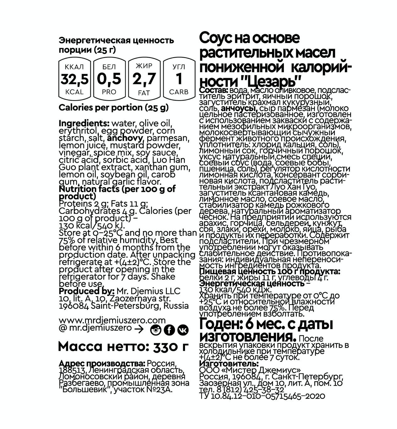 Соус пониженной калорийности Mr. Djemius ZERO "Цезарь" 330гр