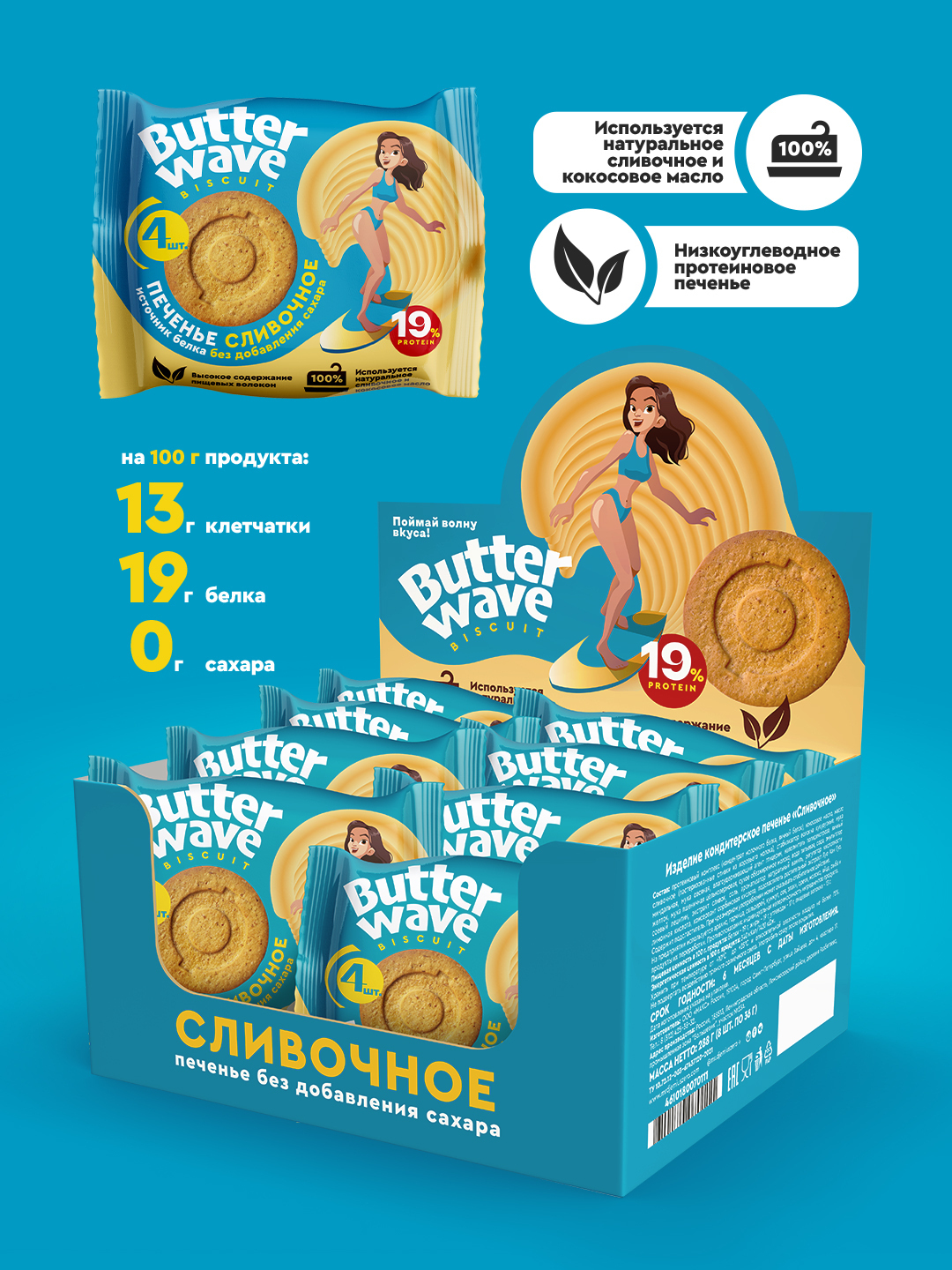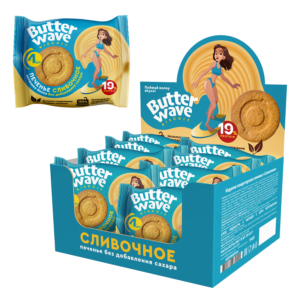 Протеиновое печенье без сахара "Butter Wave" Сливочное, коробка 32штуки (8 уп по 4шт)