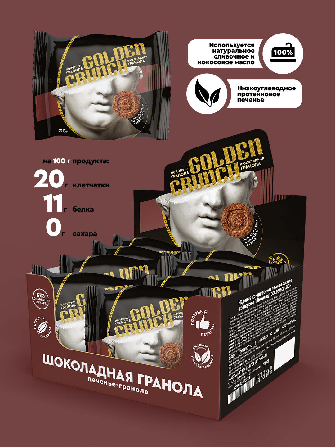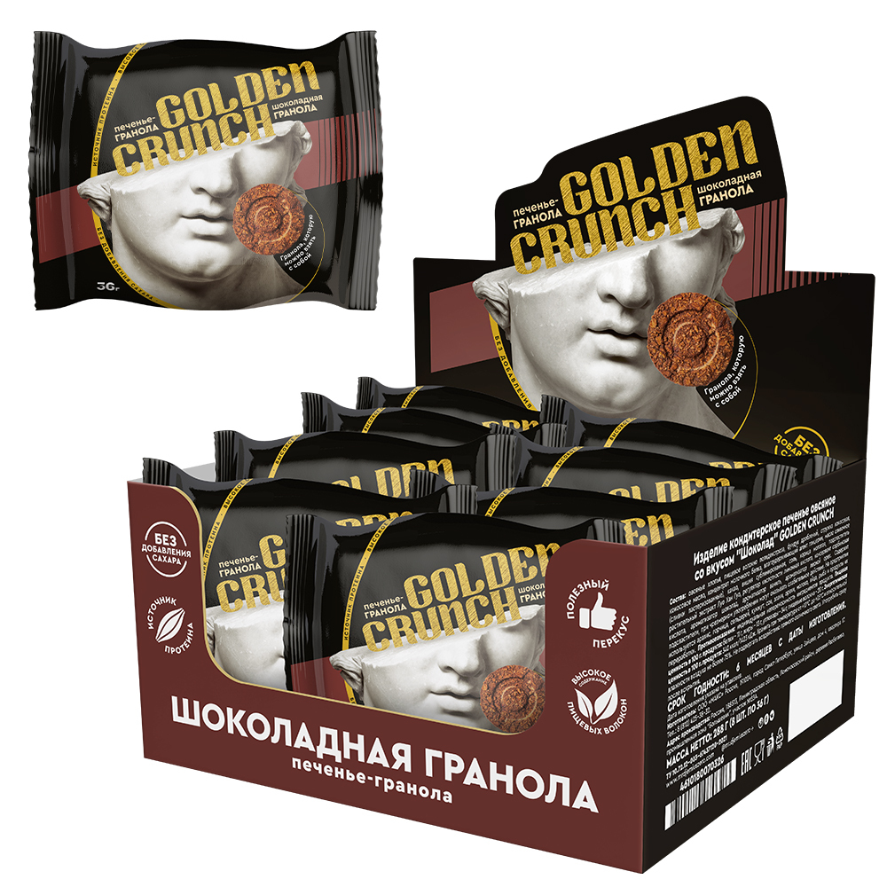 Печенье гранола овсяное со вкусом Шоколад Golden Crunch, коробка 32 штуки (8 уп по 4шт)