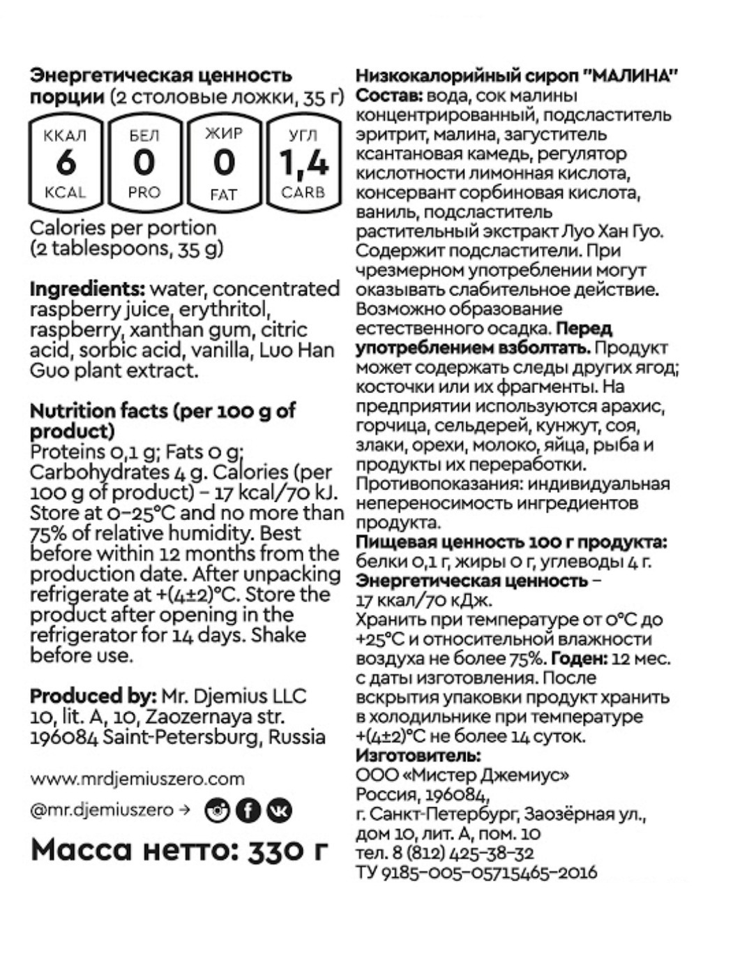 Низкокалорийный сироп Mr.Djemius ZERO "Малина" 330гр