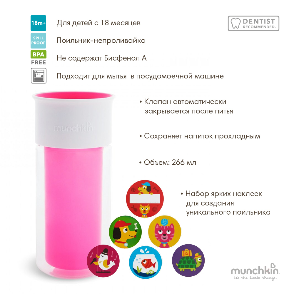 Munchkin поильник-непроливайка MIRACLE 360 с наклейками 266 мл. с 18 мес., розовый