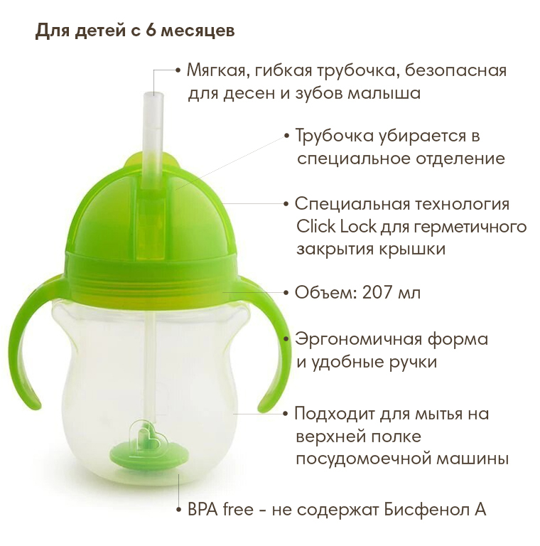 Munchkin поильник Click Lock Any Angle с трубочкой и ручками Зеленый 207 мл., с 6 мес.