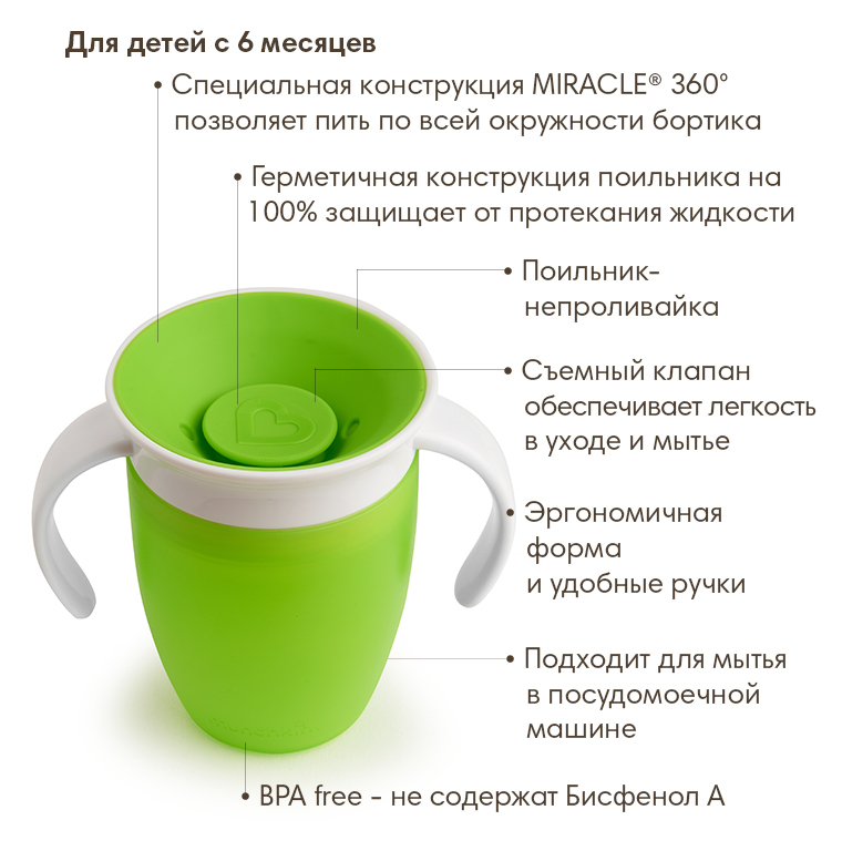 Munchkin поильник с крышкой MIRACLE 360 непроливайка, с ручками Зеленый 207мл. 6+
