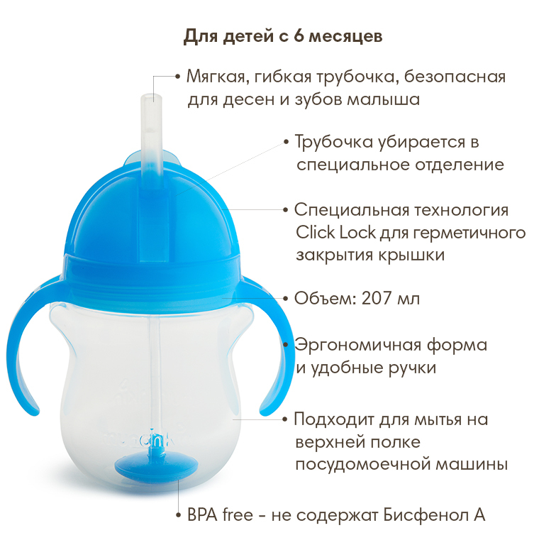 Munchkin поильник Click Lock с трубочкой и ручками 207 мл.голубой 6+
