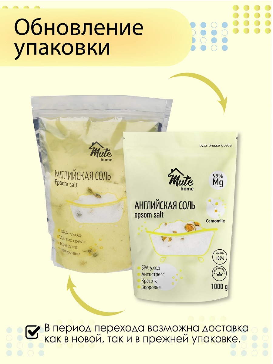 MUTE HOME Английская соль для ванны Epsom (Эпсом) / Магниевая соль с цветами Лаванды, 1000 г.