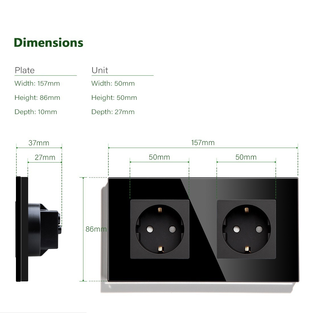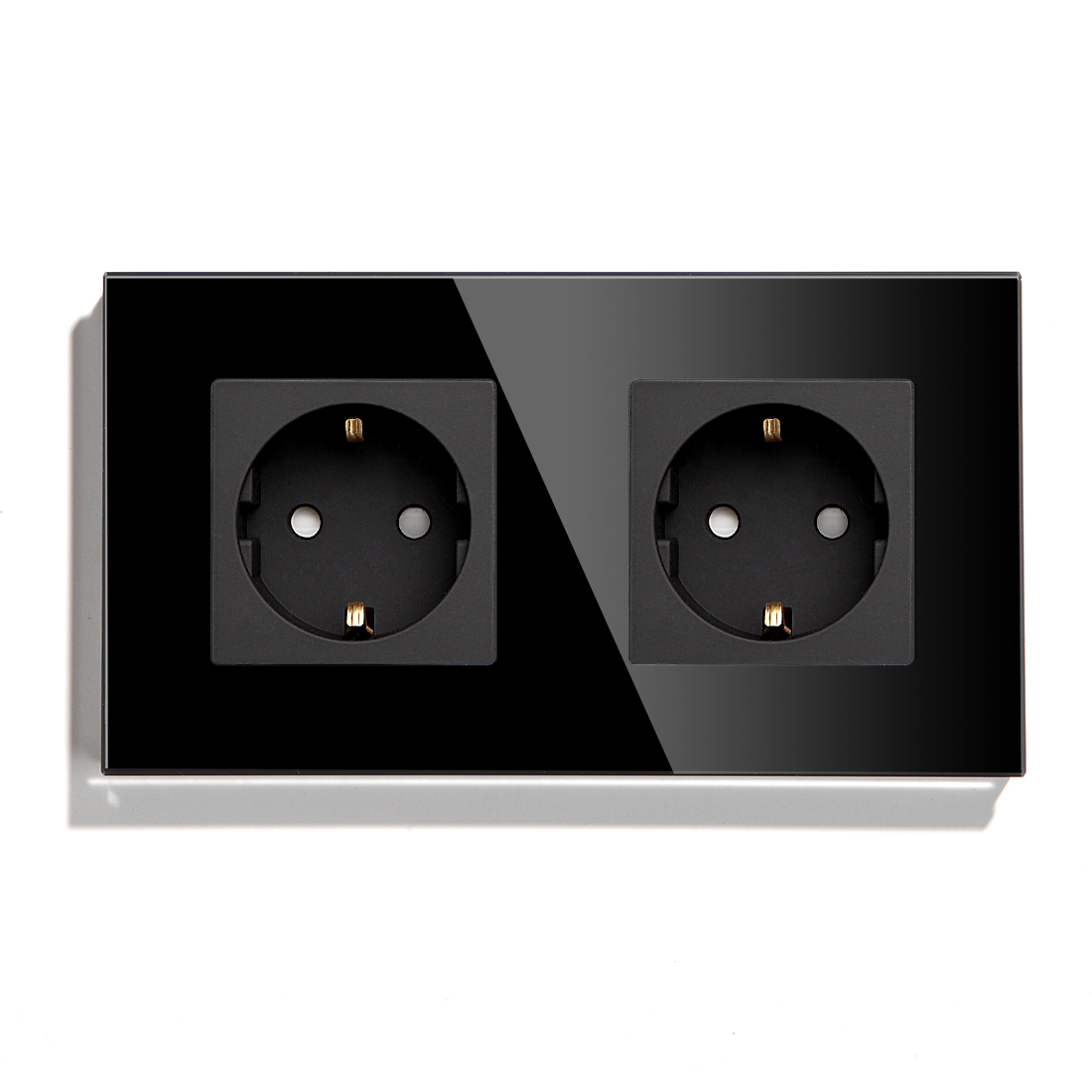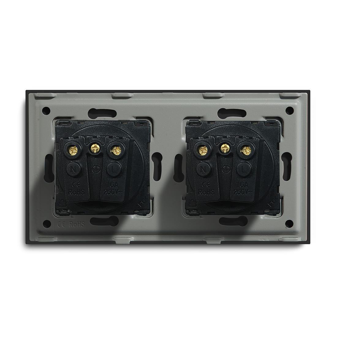 Розетка двойная евро стандарт со шторками 16А 250V 2 поста рамка закаленное стекло MVAVA Черная
