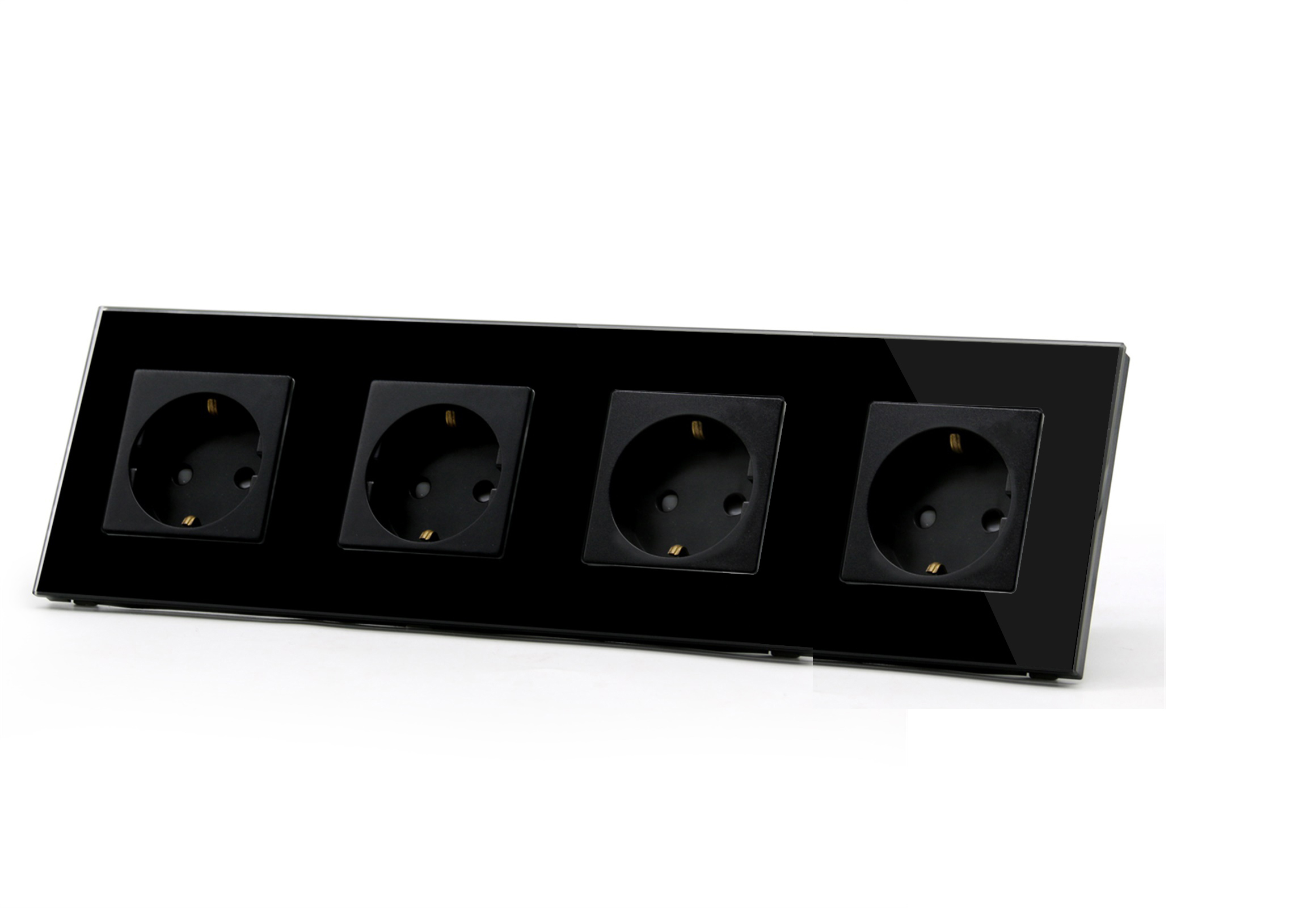 Розетка 4-х постовая евро стандарт со шторками 16А 250V 4 поста рамка закаленное стекло MVAVA Черная