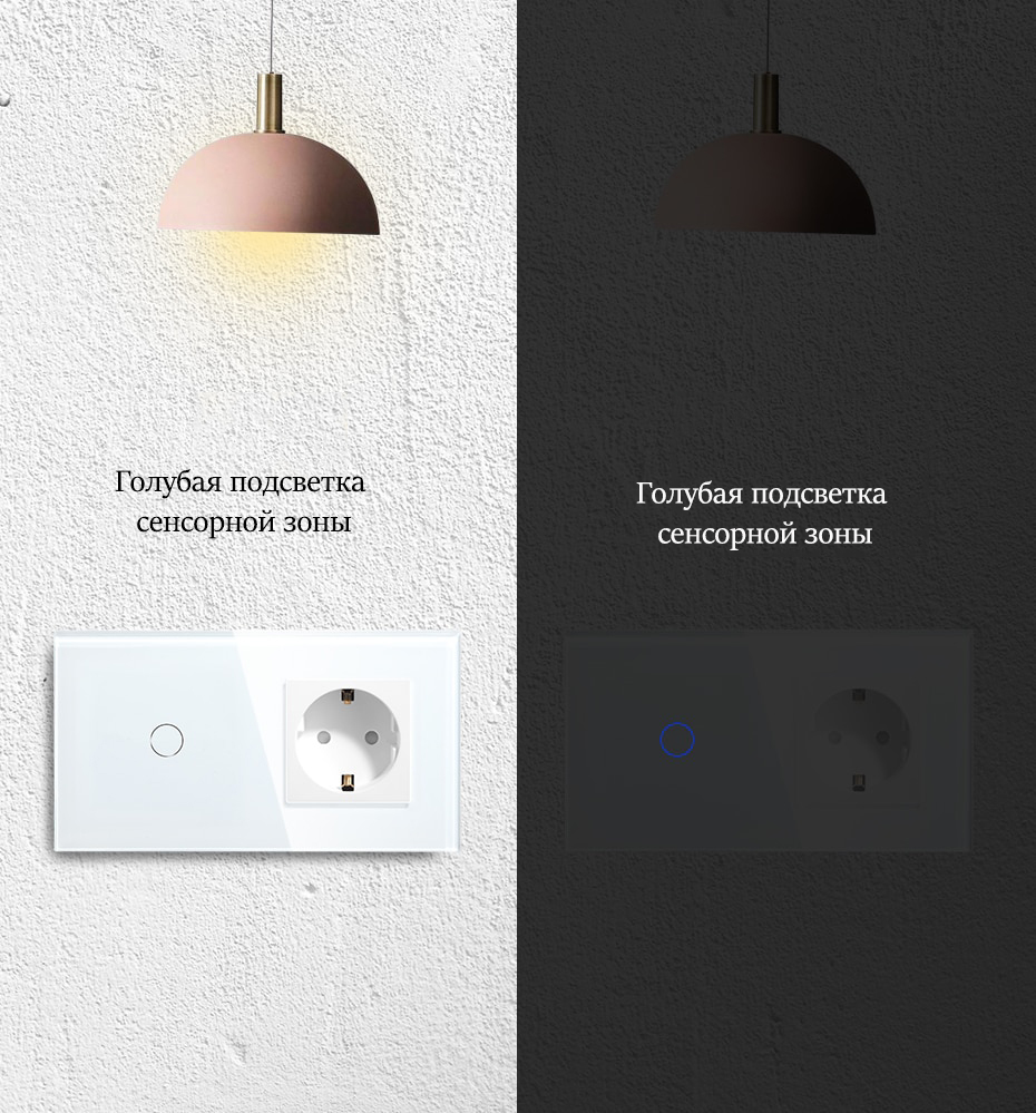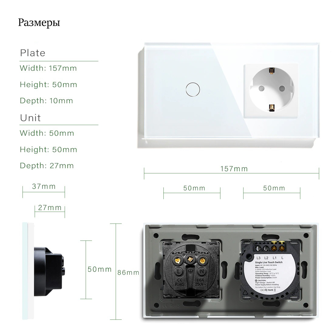 Сенсорный выключатель с розеткой Touch Switch 1 клавиша 1 розетка, 2 поста (1+1) панель стекло Белый