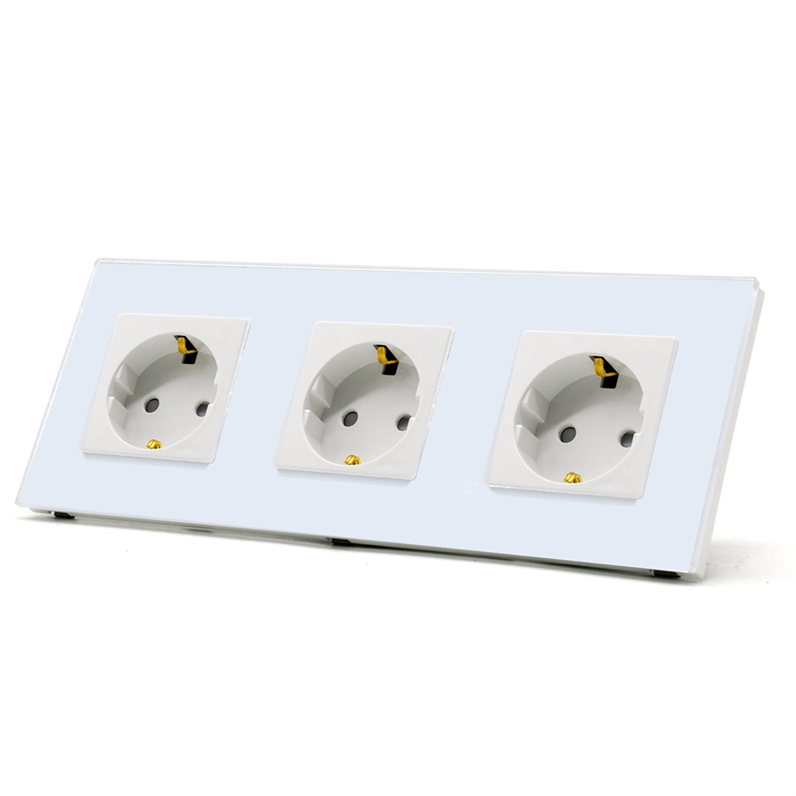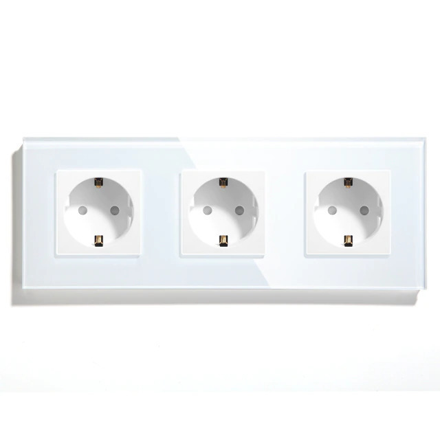 Розетка тройная евро стандарт со шторками 16А 250V 3 поста рамка закаленное стекло MVAVA Белая