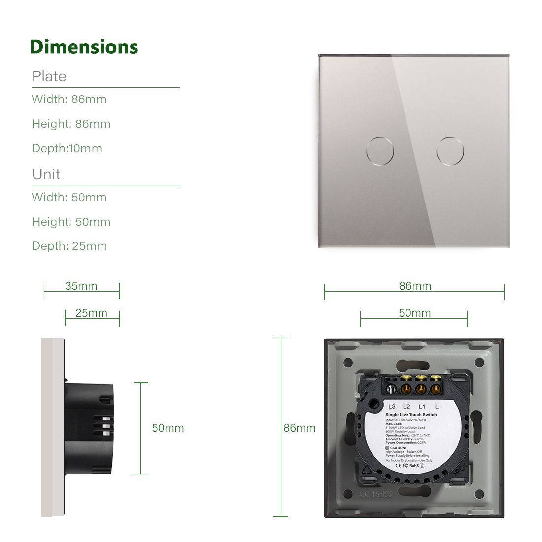 Сенсорный выключатель Touch Switch 3 клавиши, 2 поста (1+2) панель стекло Белый