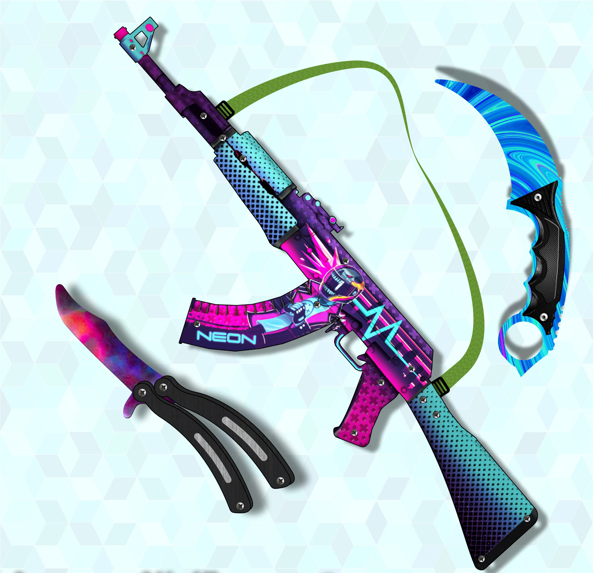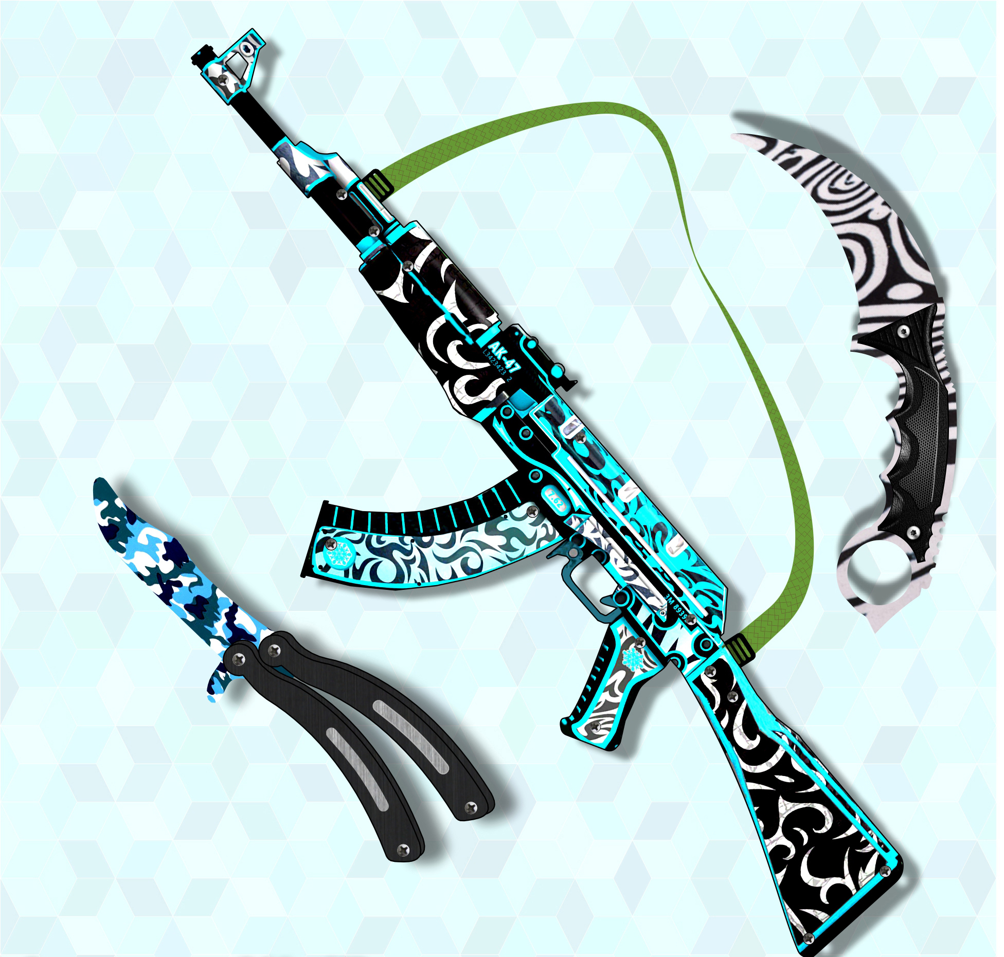Автомат с армейским ремешком, Нож бабочка, Керамбит 1+1