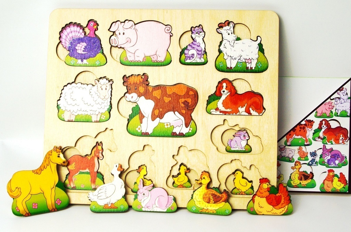 Развивающая рамка-вкладыш "Где чей малыш", деревянный пазл для детей, зоопазл