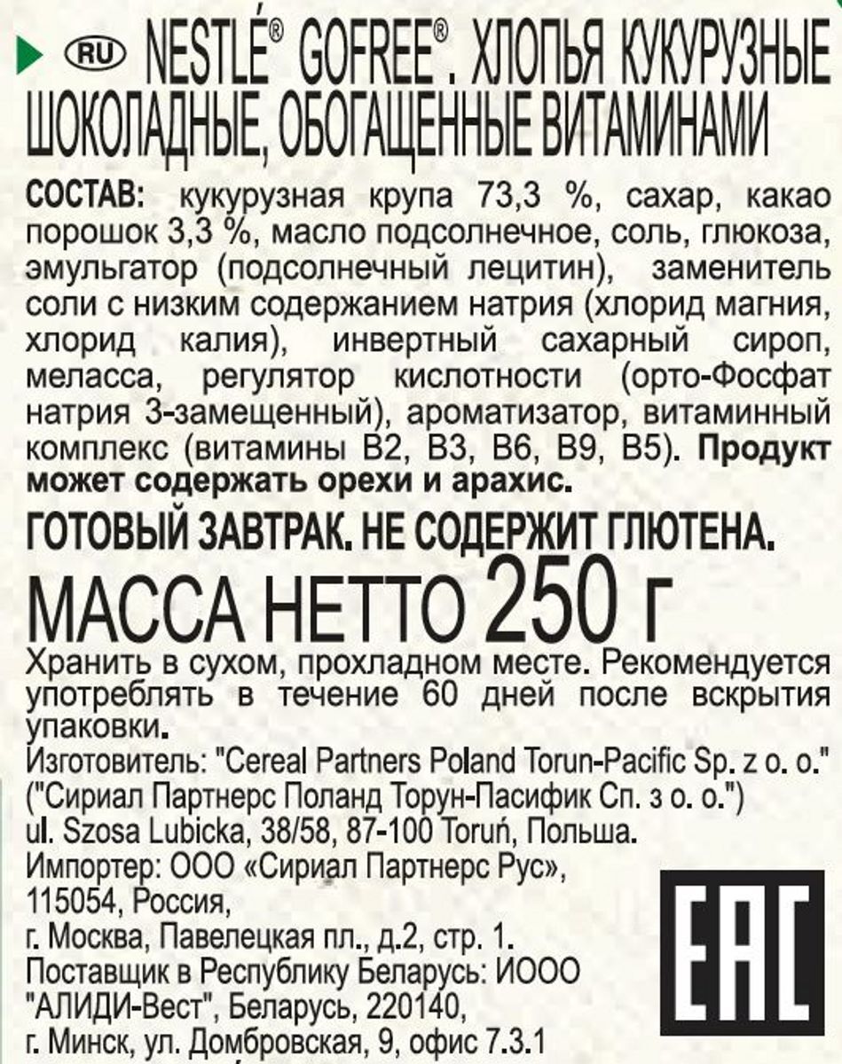 Хлопья кукурузные Nestle GOFREE, шоколадные, обогащенные витаминами, 250 г