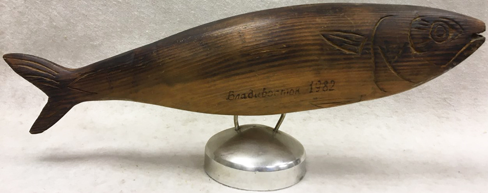 Статуэтка-сувенир "Рыба", с исторической гравировкой, дерево, металл, 1982 г. (сост. на фото)