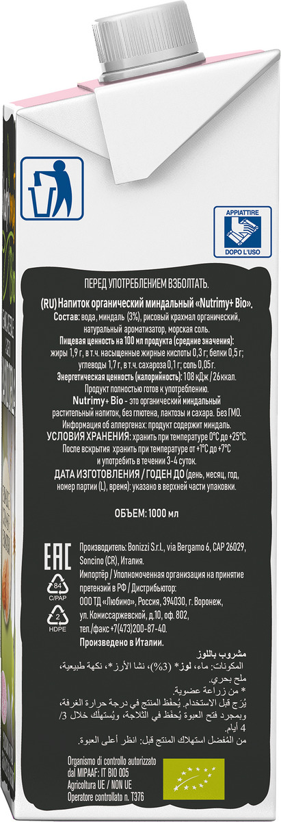 Напиток органический миндальный Nutrimy+Bio 1000 мл