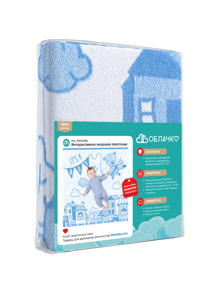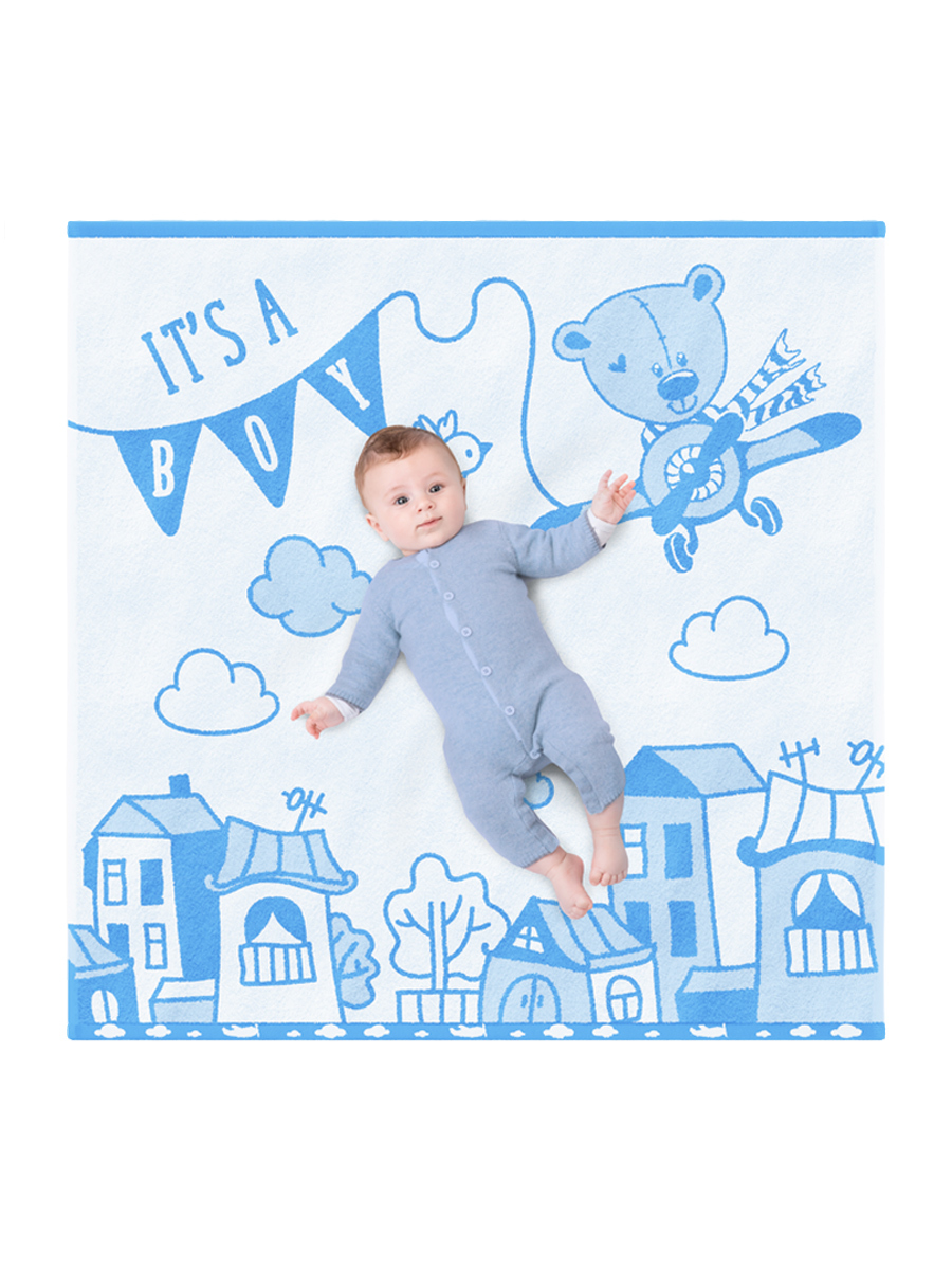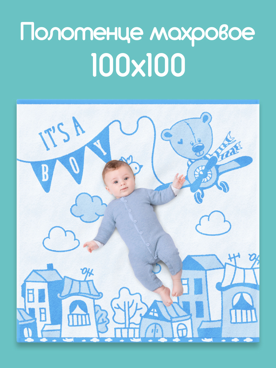 Махровое детское полотенце Облачко 100х100см дизайн "Its a boy", цвет Спокойный синий/белый, плотность 420г/м2, 100% хлопок