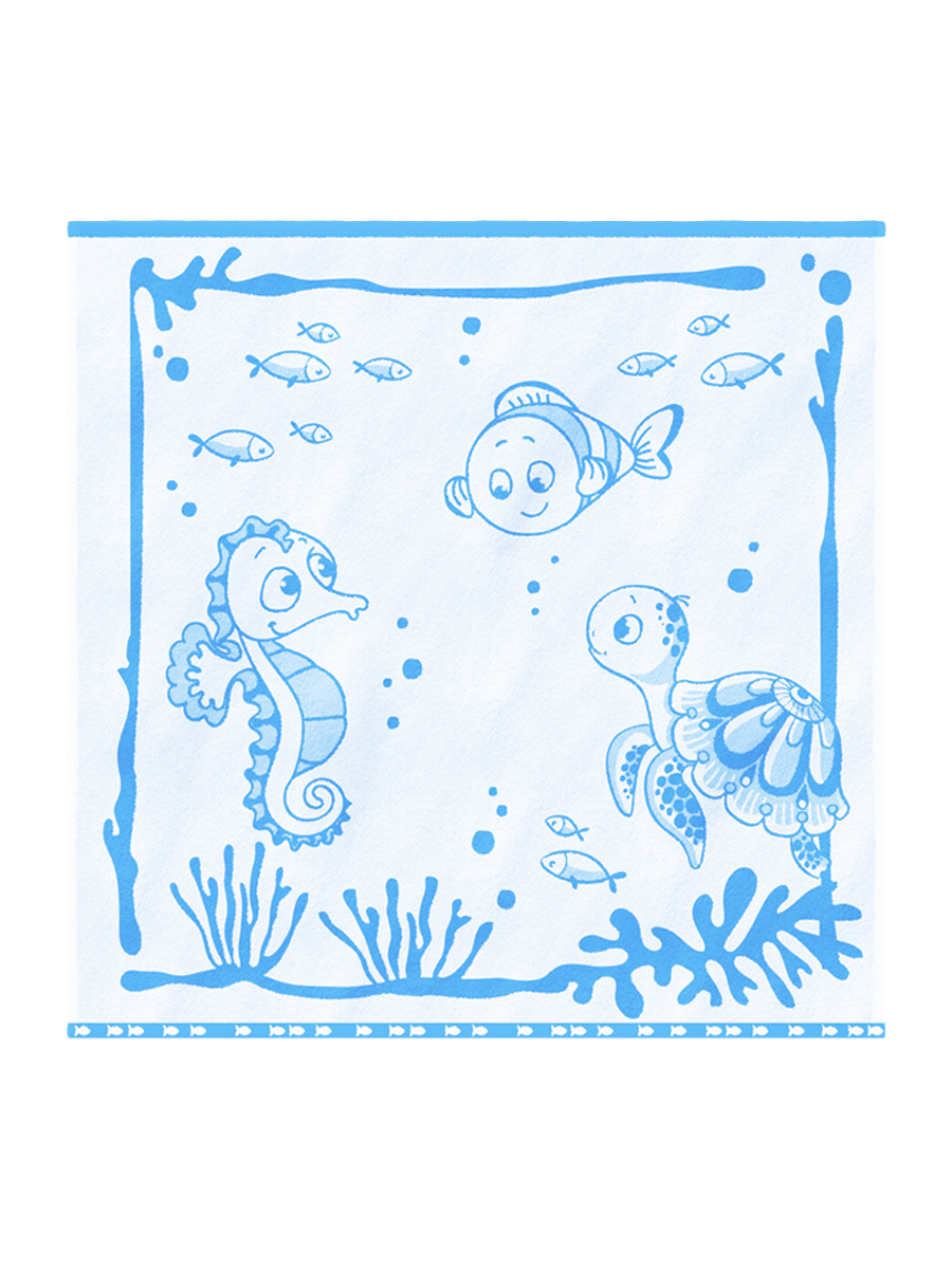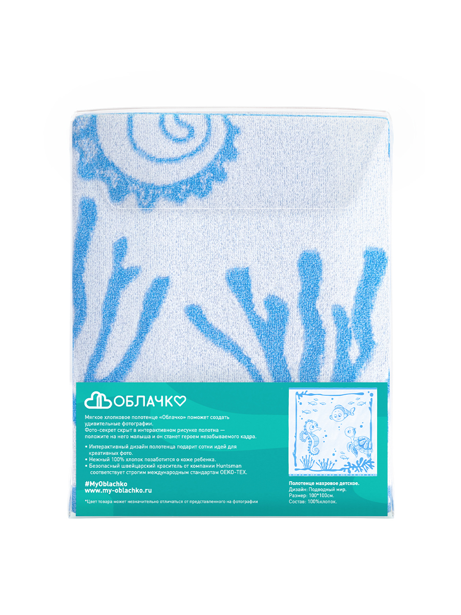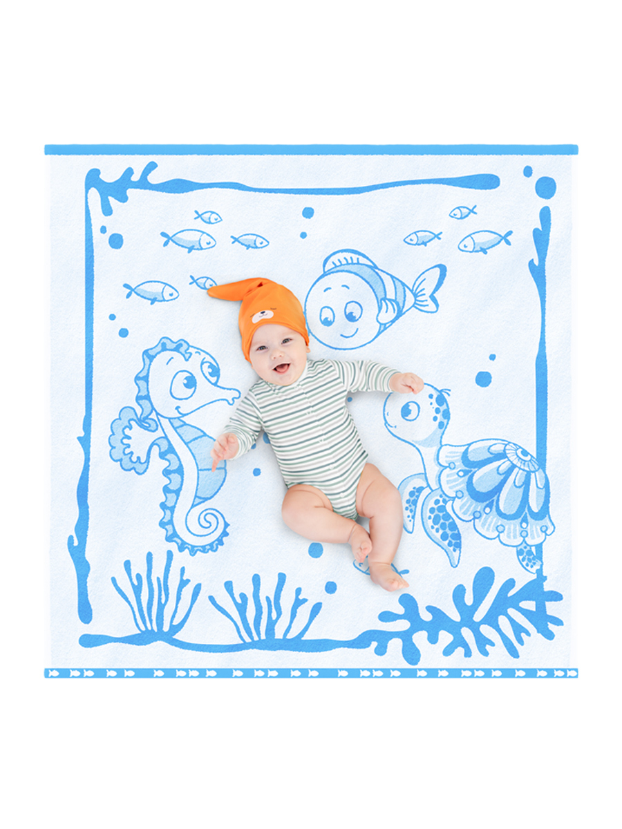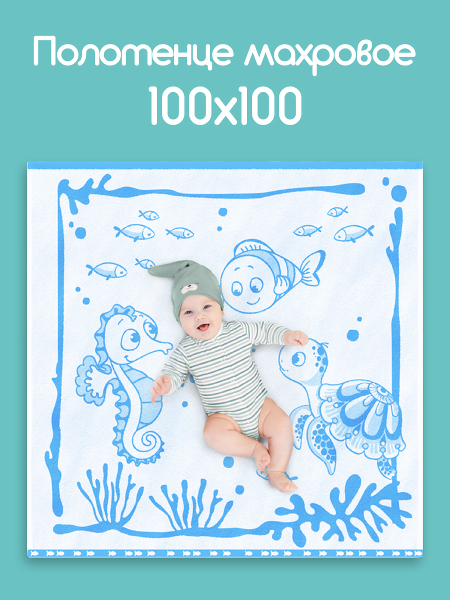 Махровое детское полотенце Облачко 100х100см дизайн "Морской мир", плотность 420г/м2, 100% хлопок