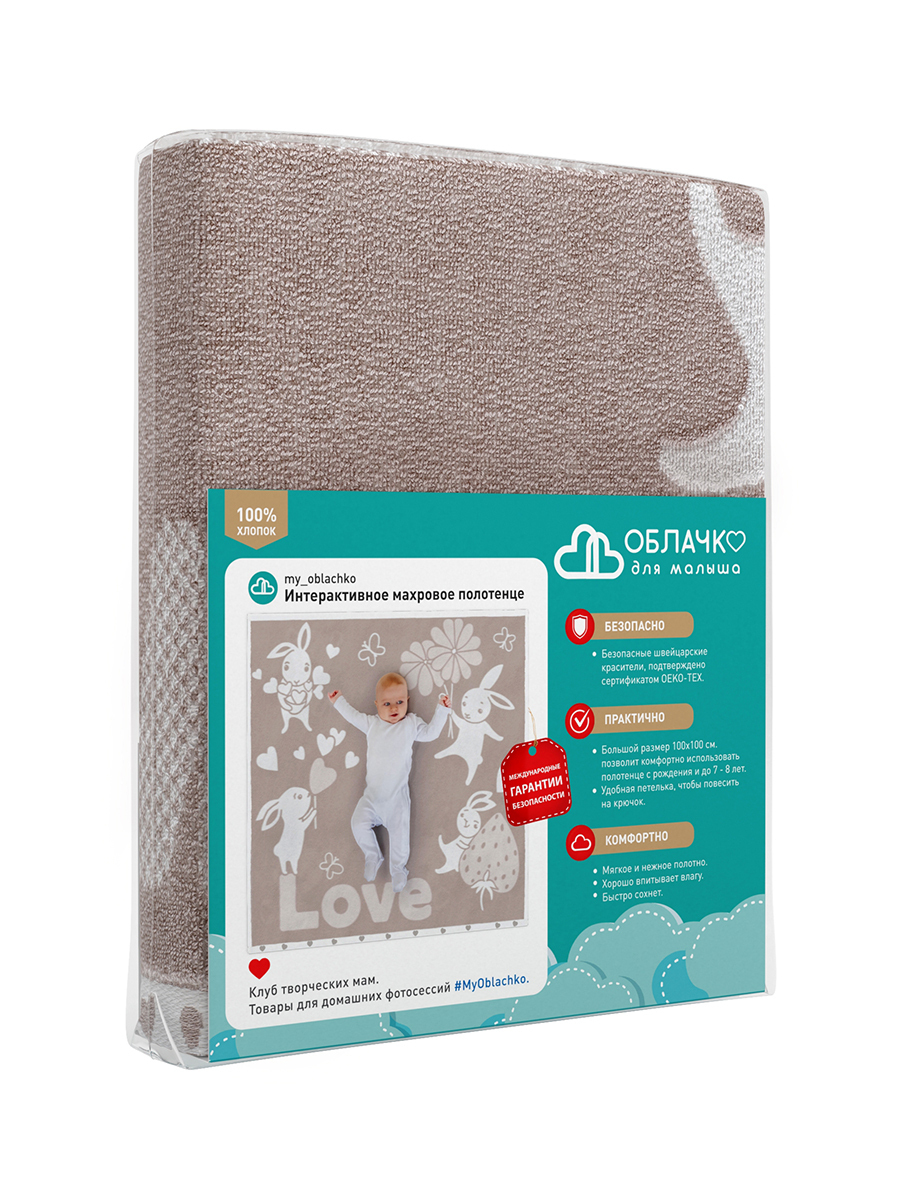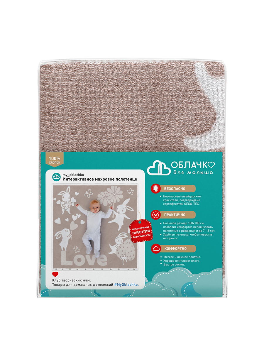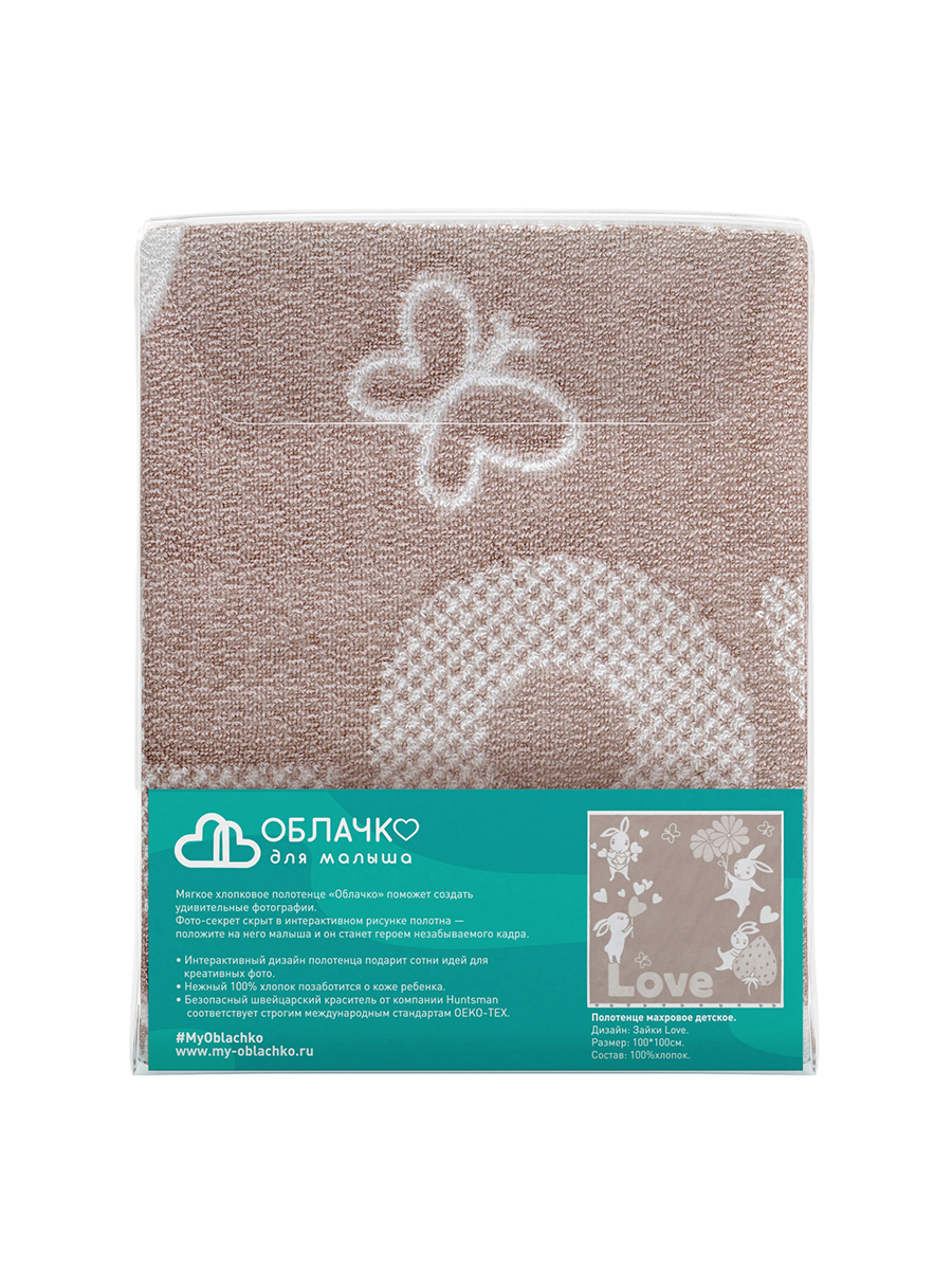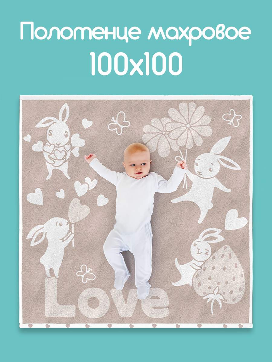 Полотенце детское махровое Облачко дизайн "Зайки Love" цвет Бежевый 100х100см, хлопок 100%, плотность 420г/м2