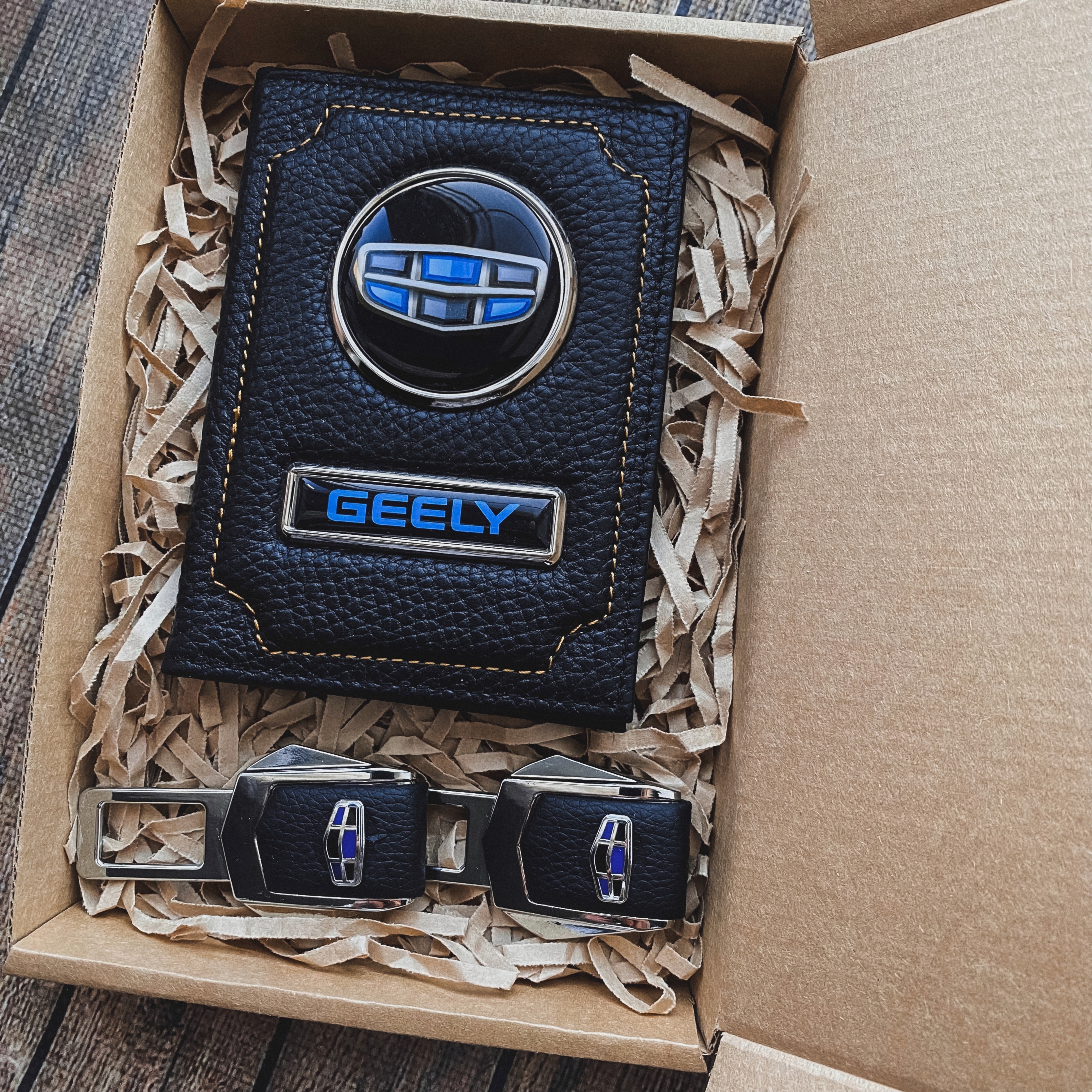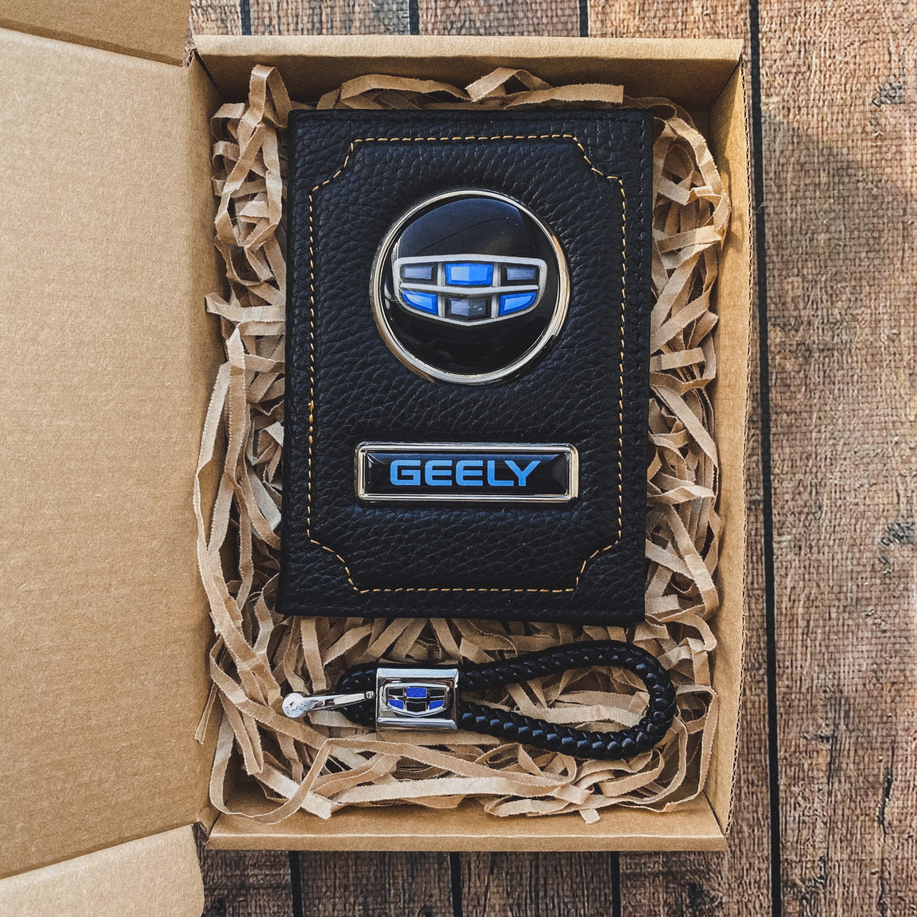 Подарочный набор автолюбителю с логотипом Geely обложка + плетённый брелок
