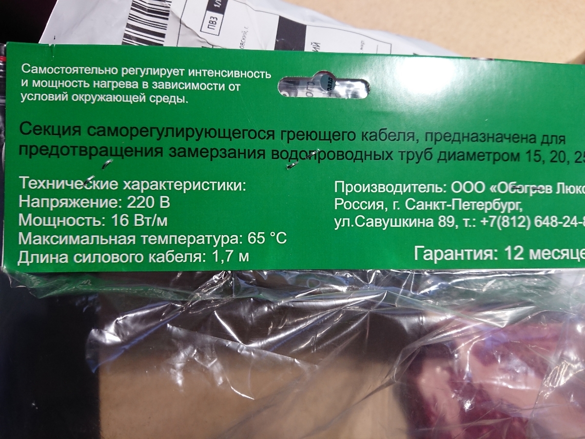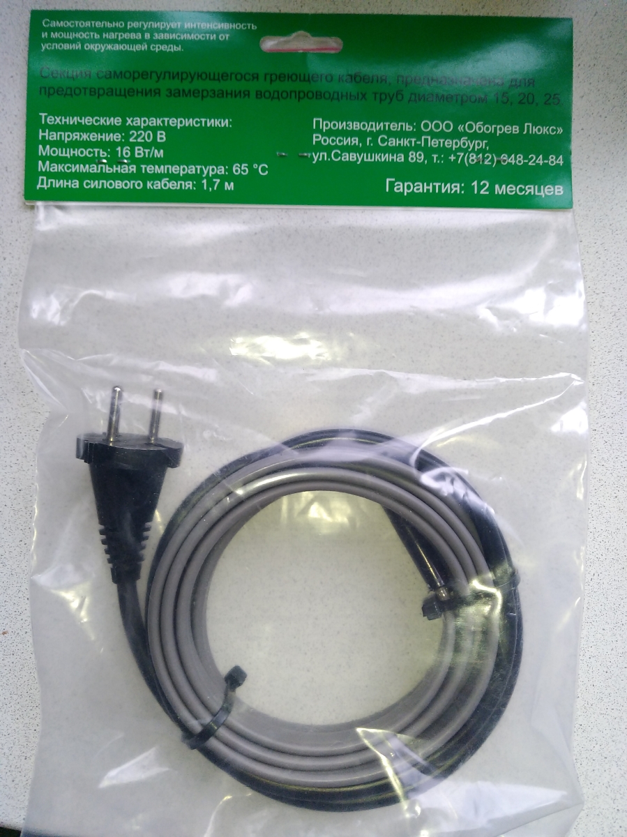 Греющий кабель Обогрев Люкс на трубу, 15м 240Вт