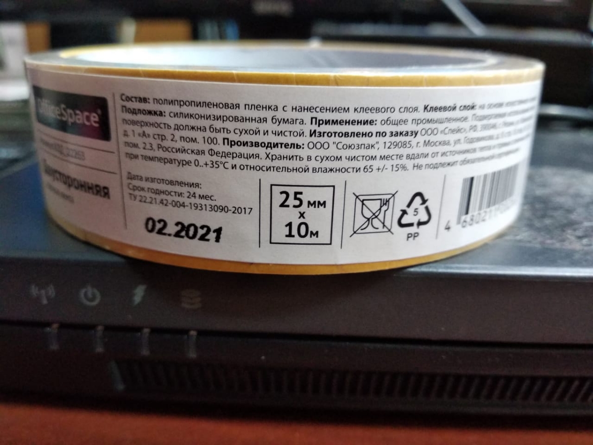 Клейкая лента двусторонняя OfficeSpace, 25 мм х 10 м, полипропилен