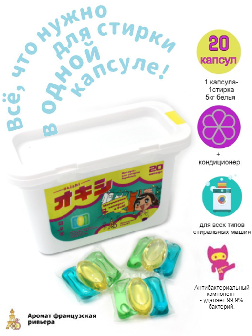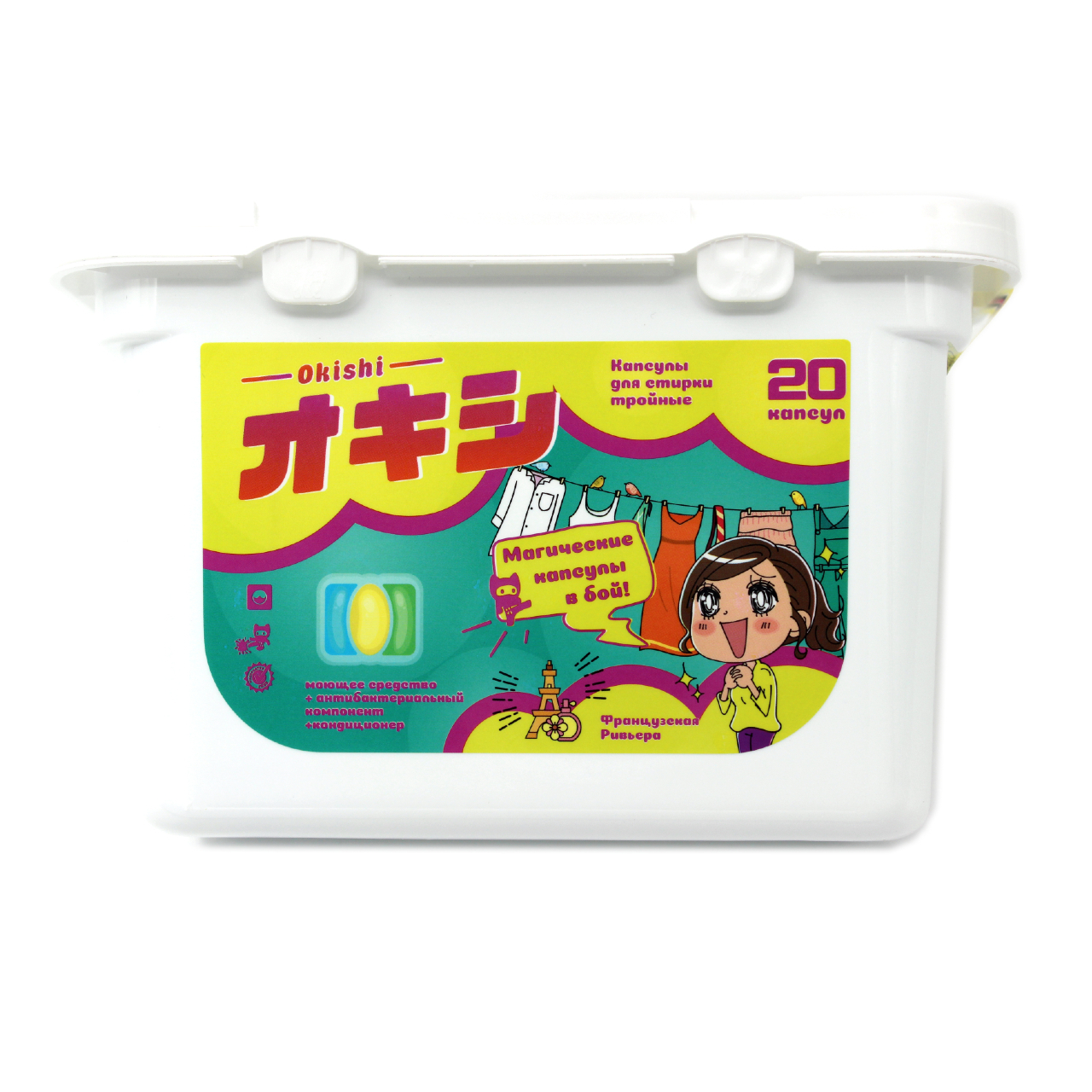 Капсулы для стирки тройные Okishi с ароматом "Французская Ривьера" 20 капсул