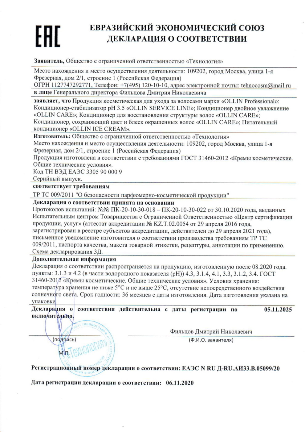OLLIN PROFESSIONAL Кондиционер ICE CREAM для увлажнения и питания Antistatic Effect 250 мл
