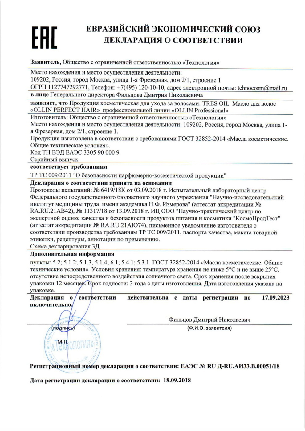 OLLIN PROFESSIONAL Масло PERFECT HAIR для увлажнения и питания Tres Oil 50 мл